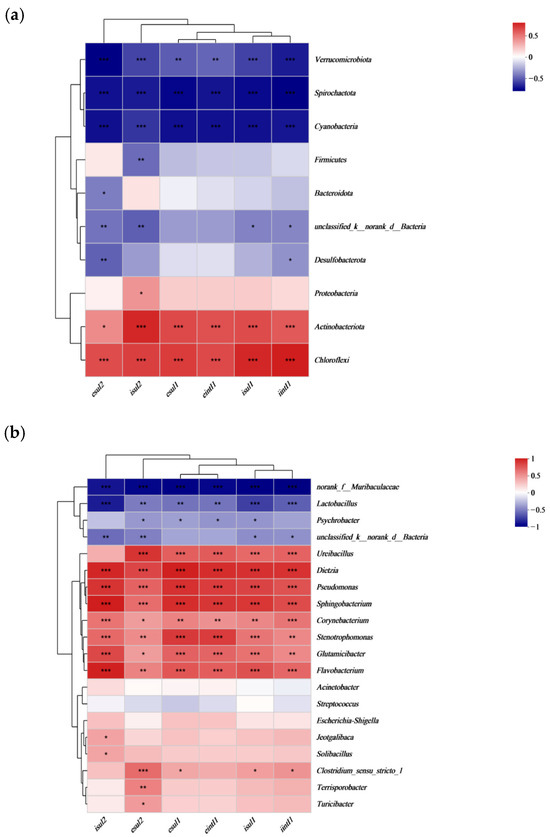 Correlation of microorganisms at the phylum (a) and genus (b) level with sulfonamide ARGs and intI1 genes. The letters ‘i’ and ‘e’ indicate intracellular and extracellular resistance genes, respectively. The color gradient from red to blue represents the spectrum of correlation, with red indicating a positive correlation and blue indicating a negative correlation. Statistical significance is denoted by asterisks, with * p < 0.05, ** p < 0.01, and *** p < 0.001.