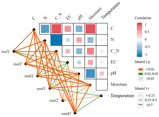 Mantel test of sulfonamide resistance genes and physiochemical parameters. The heatmap shows Spearman’s correlation coefficients for pairwise comparisons, and the width of the lines indicates the magnitude of Mantel’s r statistic for corresponding distance correlations, while the color signifies statistical significance.