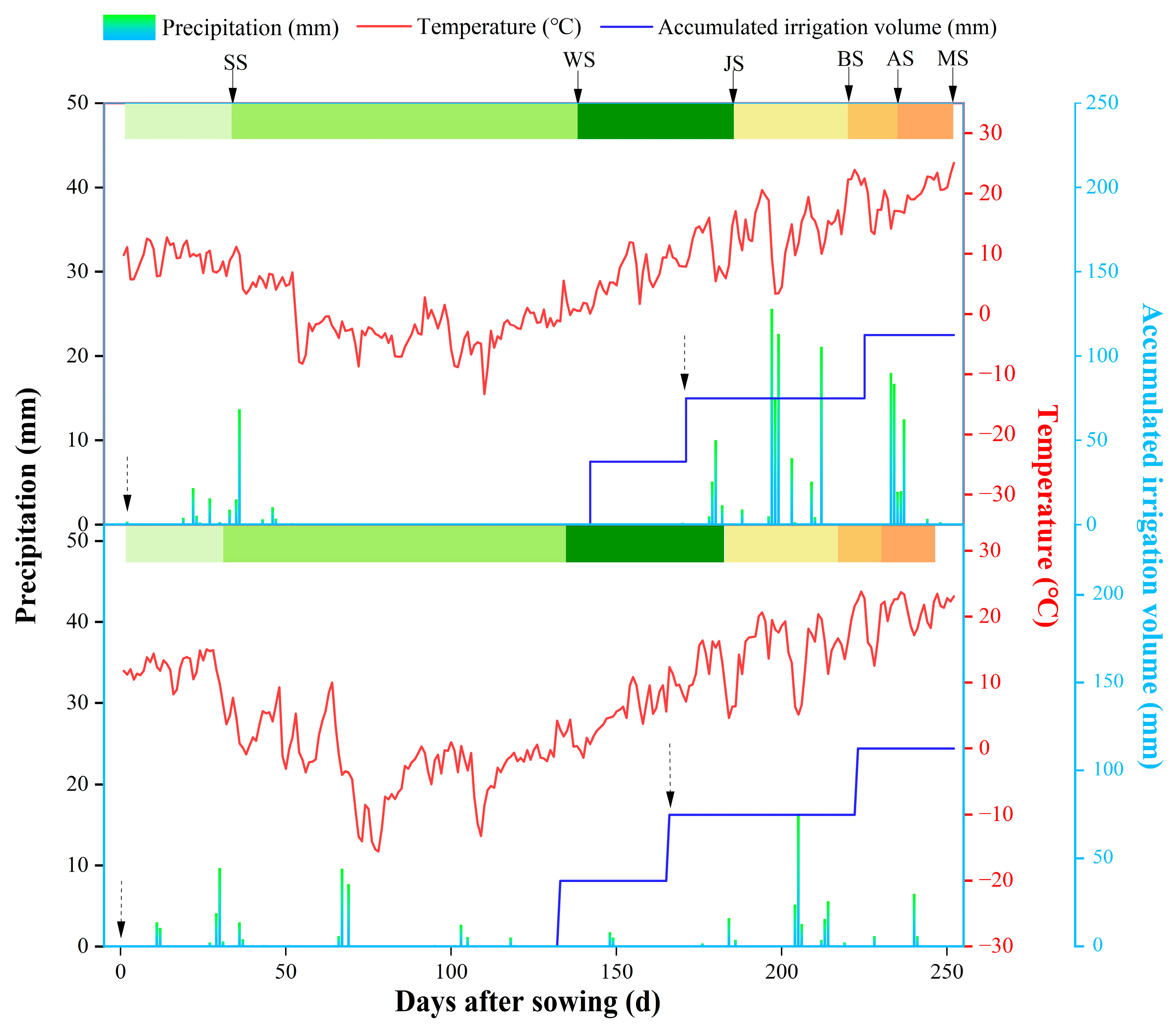 - Liu, X.; Liu, J.; Huang, C.; Liu, H.; Meng, Y.; Chen, S.; Ma, S.; Liu, Z. The impacts of irrigation methods and regimes on the water and nitrogen utilization efficiency in subsoiling wheat fields. Agric. Water Manag. 2024, 295, 108765. [Google Scholar] [CrossRef]