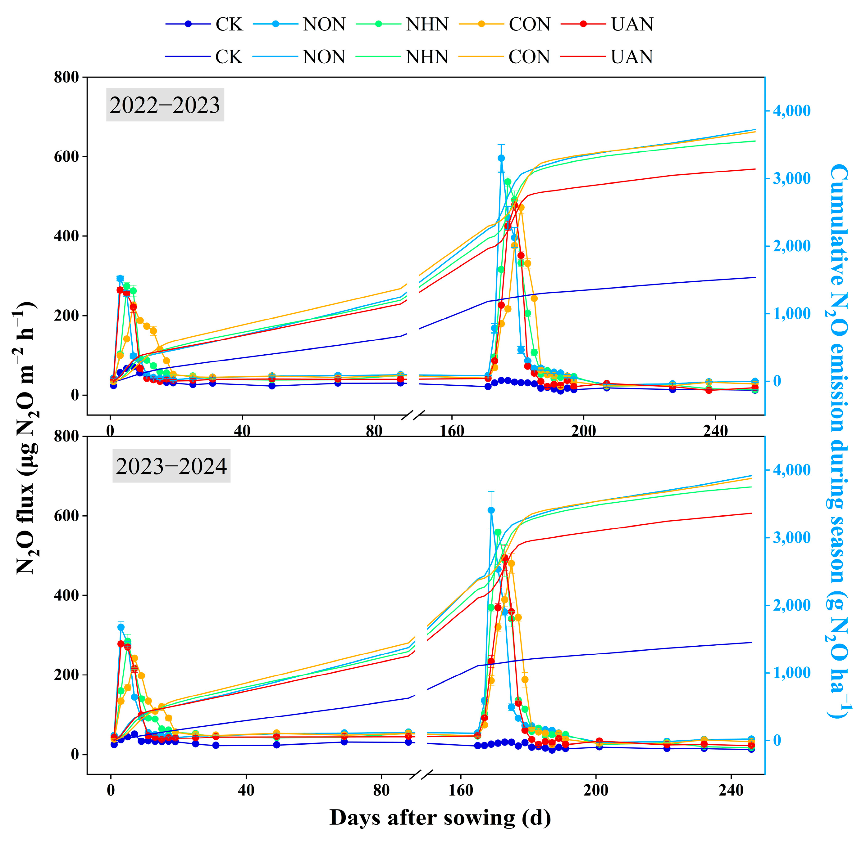 - Wang, H.; Wu, J.; Li, G.; Yuan, J. Influence of Nitrogen Addition Levels on N2O Flux and Yield of Spring Wheat in the Loess Plateau. Agronomy 2025, 15, 1377. [Google Scholar] [CrossRef]