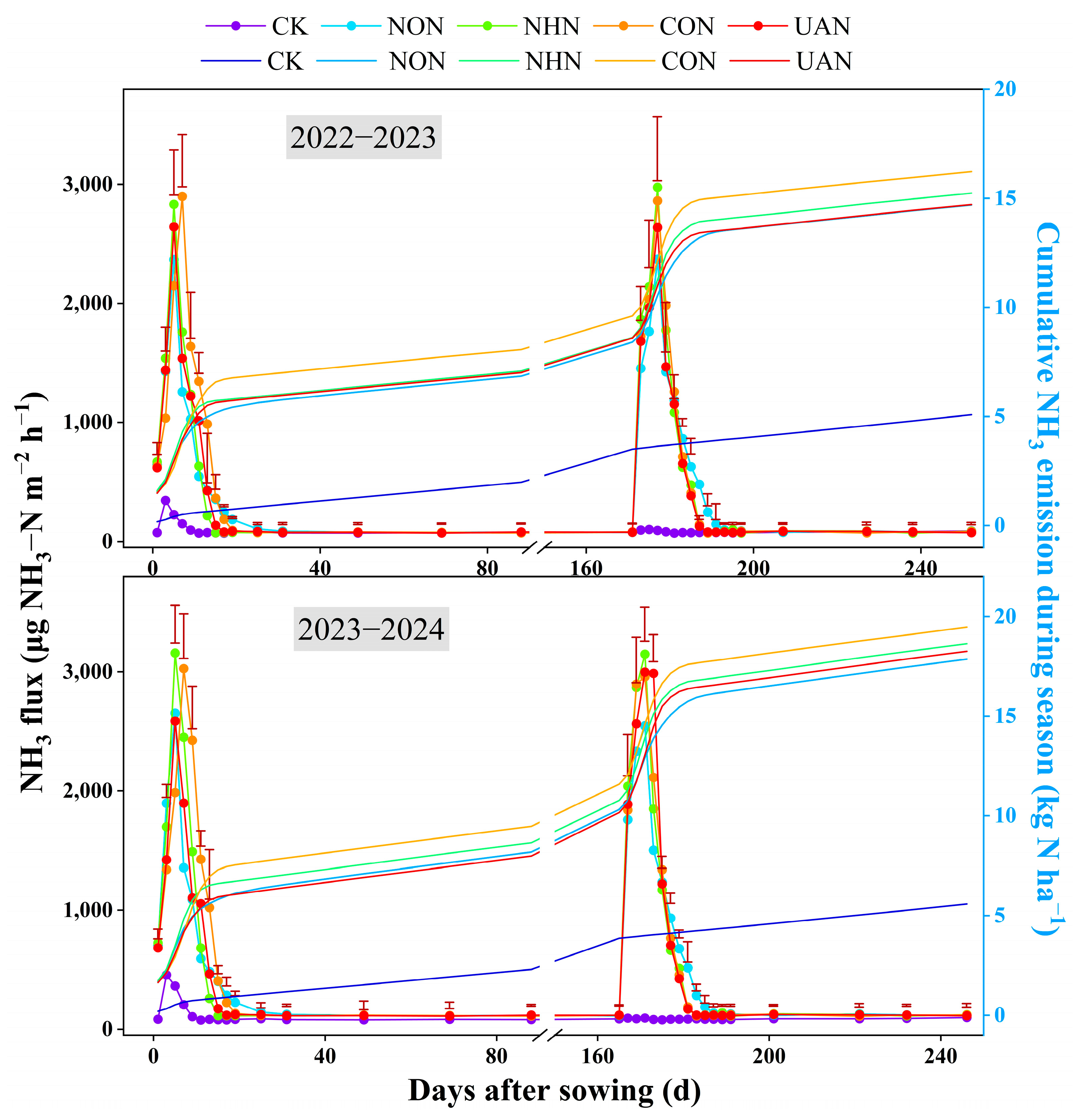 4.1. N2O Fluxes and NH3 Volatilization Under Different N Fertilizer Forms in Winter Wheat Fields