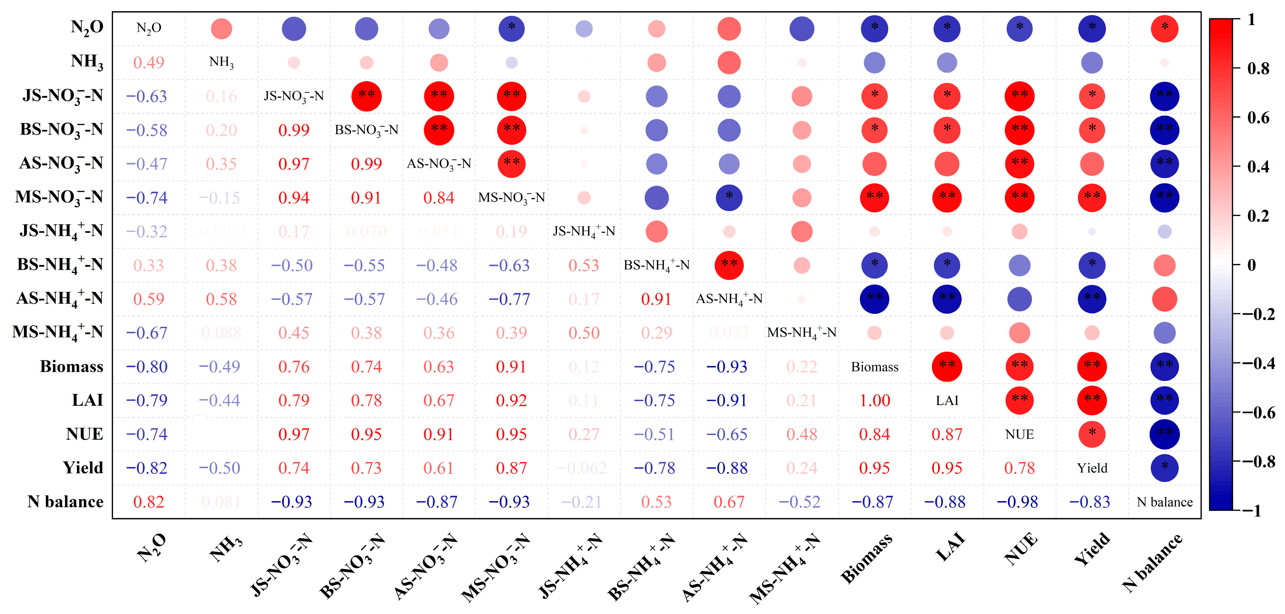 - Wang, J.; Qian, R.; Li, J.; Wei, F.; Ma, Z.; Gao, S.; Sun, X.; Zhang, P.; Cai, T.; Zhao, X.; et al. Nitrogen reduction enhances crop productivity, decreases soil nitrogen loss and optimize its balance in wheat-maize cropping area of the Loess Plateau, China. Eur. J. Agron. 2024, 161, 127352. [Google Scholar] [CrossRef]