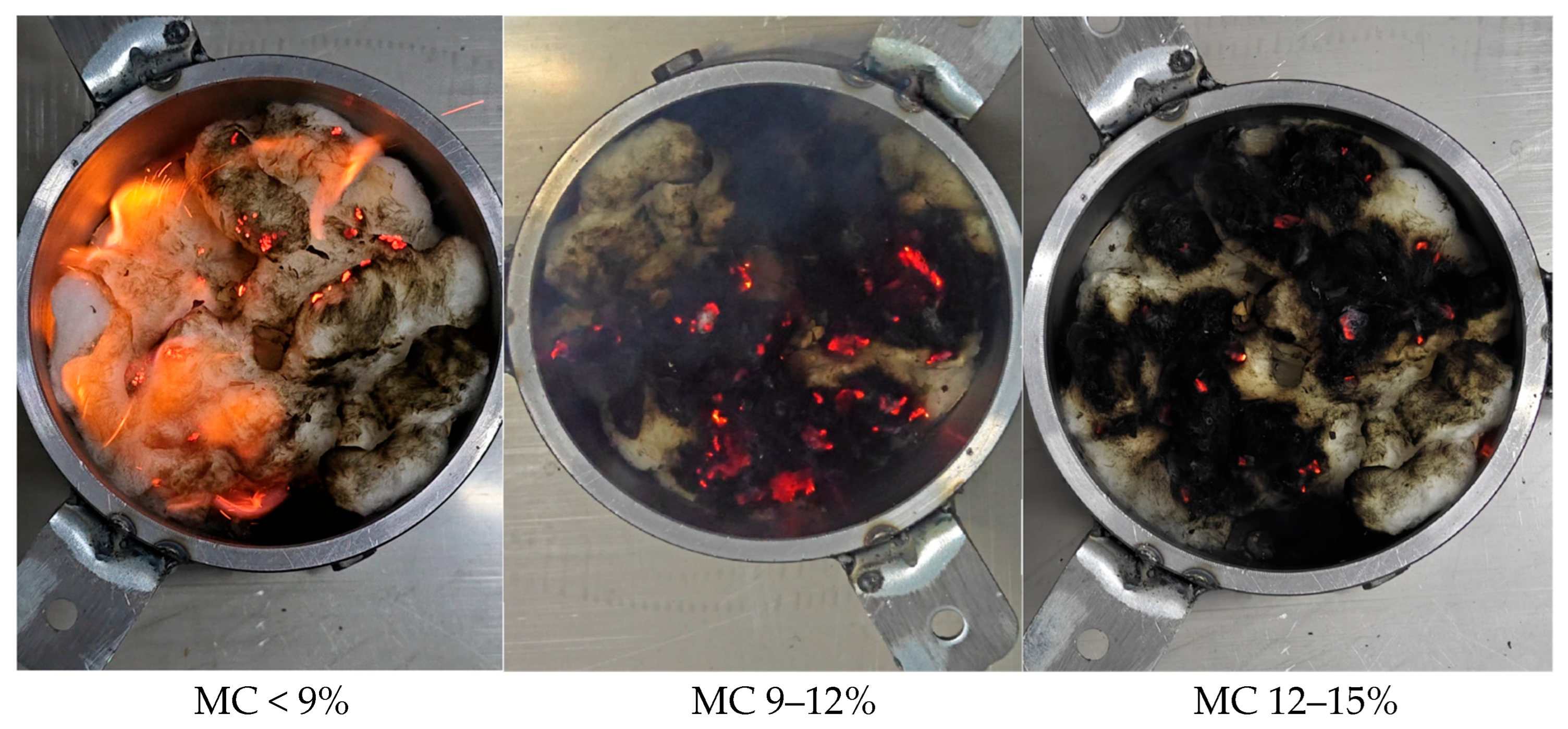 9–12% | 261.9 | 3 | 1.15 | Moist seed cotton burns with a flame that fluctuates intermittently, ranging from rapid open burning to slow smoldering | ||