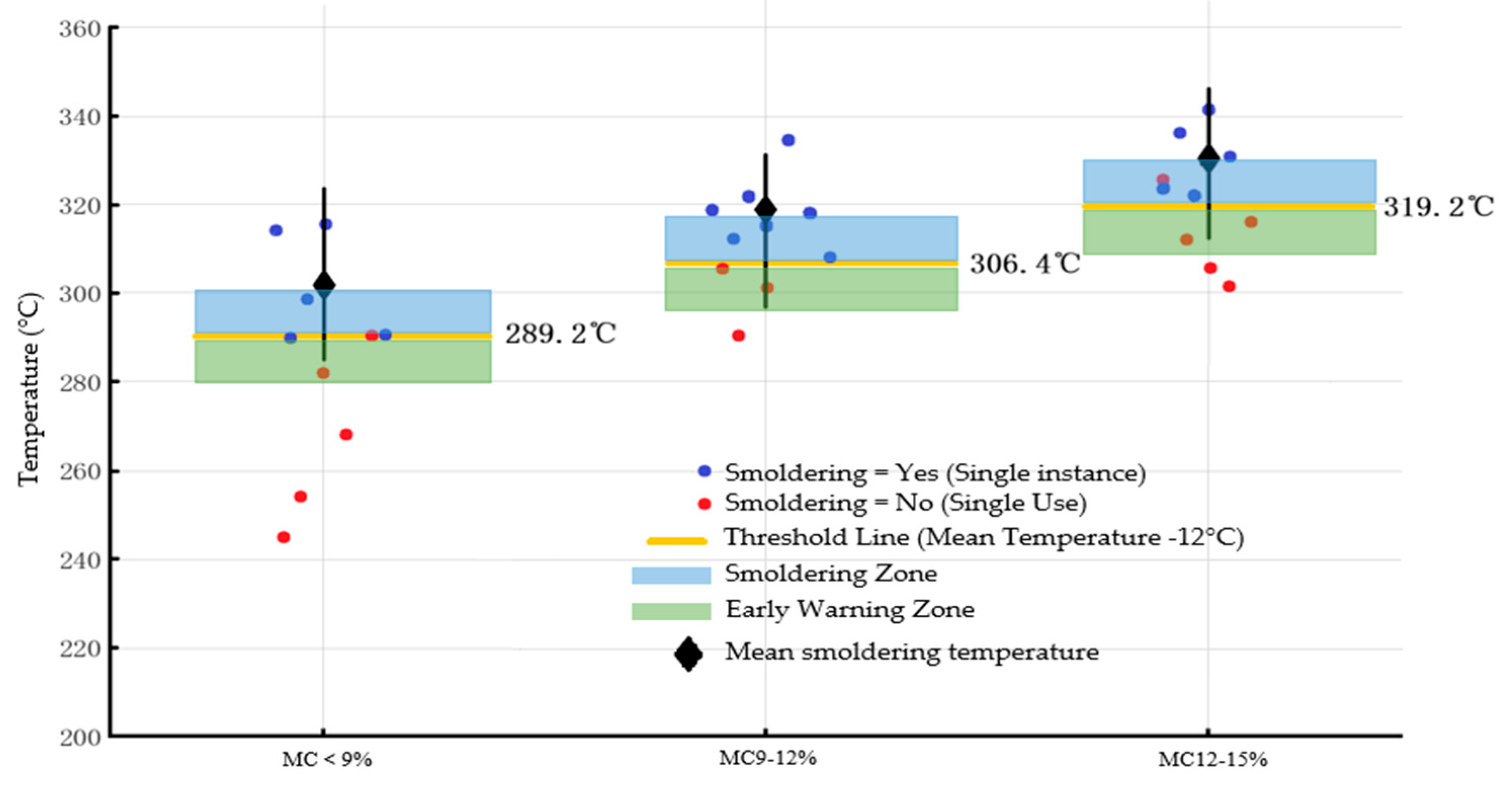 - This study quantitatively elucidates for the first time how seed cotton moisture content influences combustion characteristics. It defines critical parameters such as open flame temperature and smoldering temperature at different moisture levels, generating a threshold table directly configurable in controllers. This provides clear parameter support for the engineering implementation of fire monitoring systems.