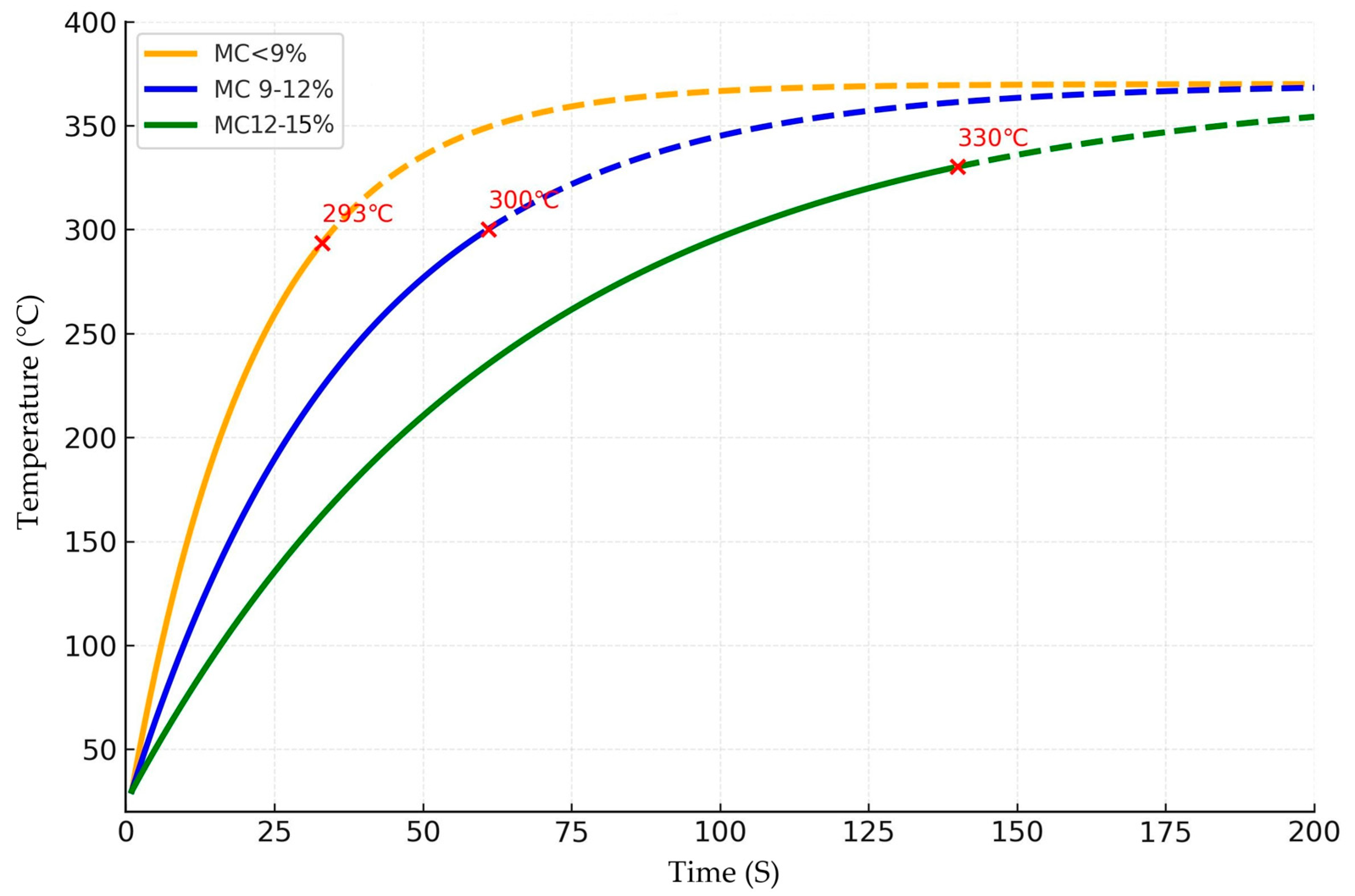 12–15% | 319.2 | 2 | 0.63 | High-moisture seed cotton requires greater friction heat to initiate smoldering combustion, with a stable but overall elevated threshold. | ||