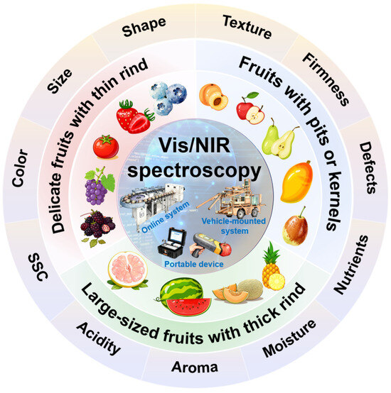The characteristic fruits play a pivotal role in global nutrition, economic stability, and cultural practices, serving as essential sources of vitamins, antioxidants, and dietary fiber while supporting agricultural livelihoods worldwide [1,2,3]. The imperative for precise quality evaluation arises from consumer demand for consistent sensory attributes and food safety, particularly as international trade expands. Traditional destructive methods (e.g., refractometry, chromatography) compromise sample integrity and lack scalability for industrial applications. Consequently, non-destructive technologies like visible and near-infrared (Vis/NIR) spectroscopy (400–2500 nm) have emerged as transformative solutions [4,5,6]. This technique leverages molecular overtone and combination vibrations to quantify internal attributes, such as soluble solids content (SSC), acidity, and bioactive compounds, without physical alteration [7,8,9]. Validation studies on apples, peaches, and mangoes demonstrate their efficacy, with prediction accuracies for SSC and defect detection [10]. These capabilities enable real-time sorting, reducing postharvest losses in commercial supply chains [11].
