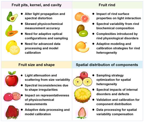 Regarding physicochemical measurement, pits and kernels can skew assessments of SSC or dry matter, as their composition differs markedly from fleshy tissues. For example, in citrus fruits, the presence of seeds or internal cavities may lead to underestimation of SSC, as these structures do not contribute to sugar content similarly to pulp [65]. To address this, calibration models must be developed using representative samples that include variations in internal structures, often requiring destructive validation to correlate spectral data with actual compositional changes [66].