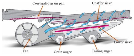 The combines used for harvesting a variety of grain crops have an important role in the advancement of agricultural technologies, aiming to harvest the field in a short and precise amount of time, with minimum losses, low cost and high productivity. The machines are, usually, complex and self-propelled and they are designed to achieve different operations in one pass, depending on the species, such as plant cutting or detachment of plant parts; plant pick-up and transport; threshing; grain separation from the mass of vegetal material; grain cleaning and transport towards the grain tank; and straw chopping and discharge [1,2]. In order to achieve these operations, combine harvesters are equipped with different systems and devices, specific to the crop that must be harvested: devices for plant cutting or for the detachment of plant parts (corn ears, sunflower heads, etc.); threshing–separating systems; cleaning devices; dehusking systems; straw chopping and discharging systems; and grain tanks and different transportation equipment’s (scraper, bucket and auger elevators, straw walkers, etc.) [3,4,5]. Under these circumstances, and taking into account the technological requirements, the combine harvesters have different operating capacities and configurations, depending on the crop, climate and terrain conditions, etc. [2]. Of all the systems and devices of the combine harvesters, the grain cleaning systems play an important part, as they aim to perform the separation and elimination of impurities, grain collection and transportation to the grain tank and ear transportation to the threshing equipment [5,6]. Consequently, cleaning systems are important for the quality of the harvested grains, which must contain only small amounts of impurities and broken grains, and are considered one of the key systems of combine harvesters [7,8,9,10]. The operating process of the cleaning system is based on the pneumatic and mechanical separation of a mixture containing grains and other than grain material (MOG), resulting from the threshing unit and straw walker system. The efficiency of the cleaning unit depends on both its design and its settings. The basic design of a cleaning system consists of an outer, fixed shell and an inner, mobile shell, which has an oscillatory motion; the inner shell contains two overlapped sieves (Figure 1) [2,4]. The fixed shell is equipped with a fan, which directs the air flow towards the two sieves and the back of the combine, in an inclined direction, and two augers: the grain auger for the clean grains and the tailing auger for the heads (which are returned to the threshing unit). The upper sieve has a special design, with adjustable openings, while the lower sieve has round openings and may be changed, depending on the grain type and dimensions [5,11].