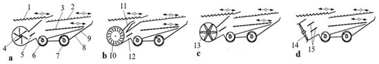 Cleaning systems of combine harvesters [2,5,10]: (a) radial-flow fan; (b) cross-flow fan; (c) axial-flow blower in cross-axial position; (d) axial-flow blower in longitudinal-axial position: 1—grain pan; 2—upper sieve; 3—lower sieve; 4—radial fan; 5—simple vane; 6—grain auger; 7—tailing auger; 8—fixed housing; 9—oscillating housing; 10—cross-flow fan; 11—upper discharge duct; 12—lower discharge duct; 13—axial flow blower in transverse position; 14—axial flow blower in longitudinal position; 15—double vane.
