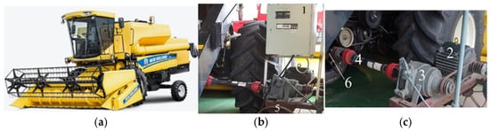 New Holland TC 5050, Plock, Poland combine harvester and S1 test rig: (a) general view of the combine; (b) S1 test rig general view; (c) components of the test rig: 1—variable frequency drive; 2—asynchronous electric motor; 3—planetary reduction gear with brake; 4—drive shaft; 5—frame on wheels; 6—shaft of the combine fan.