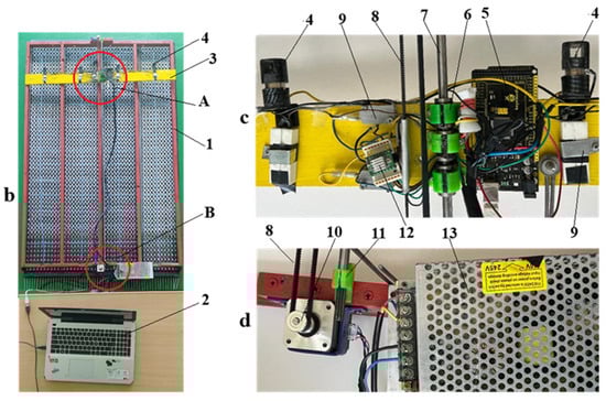 S2 test rig: (a) general view; (b) components of the test rig; (c) detail “A”, automation components; (d) detail “B”, driving system of the supporting plate; 1—frame; 2—computer; 3—supporting plate; 4—anemometer-type sensors; 5—Arduino Mega 2560, IT microcontroller board; 6—axial bearings; 7—sliding rod; 8—toothed belt transmission; 9—limiting switch; 10—step-by-step motor; 11—fixtures of the sliding rod; 12—stepper motor driver; 13—power source.
