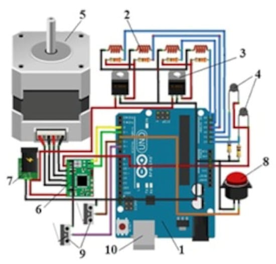 Connections diagram: 1—Arduino Mega 2560, IT microcontroller board; 2—anemometer-type velocity sensors; 3—voltage stabilizers IC; 4— NTC 100K, CN temperature sensors; 5—step-by-step motor NEMA 17 type; 6—A4988 stepper motor driver; 7—power source; 8—start button; 9—limiting switches; 10—USB port.