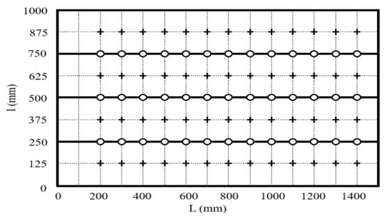 Points on the sieve’s surface where air velocity was measured or interpolated. “+”—points where air velocity was measured; “o”—points where air velocity was interpolated using the RBF model; L—sieve length, mm; l—sieve width, mm.