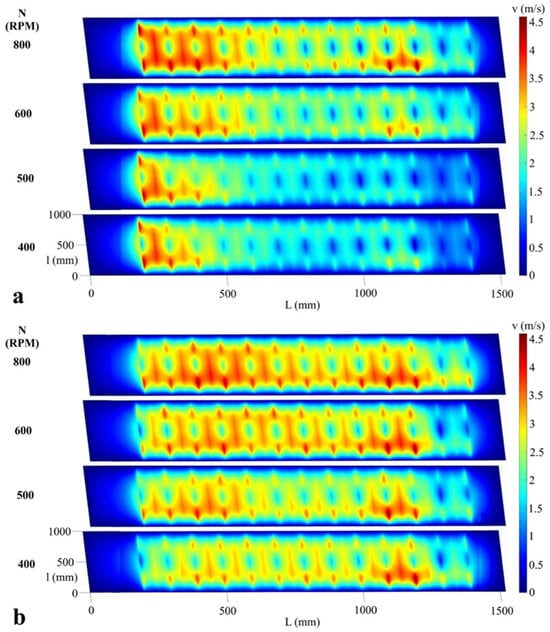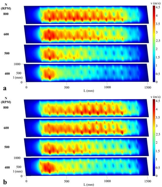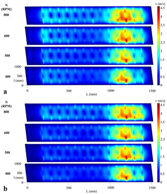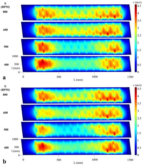 Air velocity field (m/s) on the surface of the upper sieve at 400, 500, 600 and 800 rev/min (RPM), upper sieve louvers in position 1/4, lower sieve louvers in position 0. (a) Vanes in variant A and (b) Vanes in variant B.
