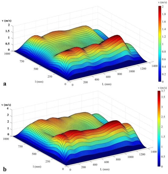 Three-dimensional representation of the air velocity field (m/s) on the surface of the upper sieve, with the vanes positioned in variant B, the louvers of the upper sieve in position 3/4, the louvers of the lower sieve in position 1/2. (a) 400 rev/min fan speed and (b) 800 rev/min fan speed.