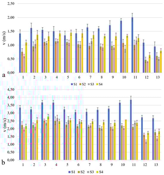 Air flow velocity measured on the surface of the upper sieve and its standard deviation, with the deflectors in position B, with the upper sieve in position 3/4, with the lower sieve in position 1/2, and for the fan speed of (a)—400 (RPM) and (b)—800 (RPM); v—air flow velocity (m/s); 1, 2, 3, …, 13—air flow velocity measurement zones along the sieve; S1, S2, S3, S4—anemometric sensors for measuring the air flow velocity in the transverse plane.