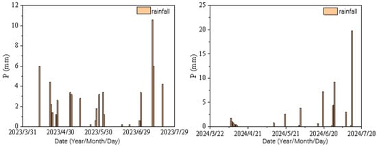 This study was conducted at the Shiyang River Experimental Station of China Agricultural University (geographic coordinates: 37°52′ N, 102°50′ E, altitude 1581 m) from 2023 to 2024. This region has a temperate arid continental climate with abundant light and heat resources, with the annual average sunshine hours exceeding 3000 h, multi-year average temperature of about 8 °C, frost-free period of 150 days, and large day–night temperature difference, all in favor of agricultural production [21]. However, this region is arid with scarce annual rainfall, with an annual average rainfall of 164 mm, a water surface evaporation of up to 2000 mm, scarce water resources, and a groundwater depth of 40–50 m. During the experimental period (spring wheat growth stage: 30 March–26 July 2023; 30 March–14 July 2024), the routine meteorological data of the experimental station were obtained through continuous monitoring by the station’s automatic weather station (Weather Hawk USA) including wind speed, rainfall, solar radiation, and other parameters. The instrument automatically recorded one set of data every 15 min. The average precipitation during the entire growth stage of spring wheat from 2023 to 2024 is shown in Figure 1.