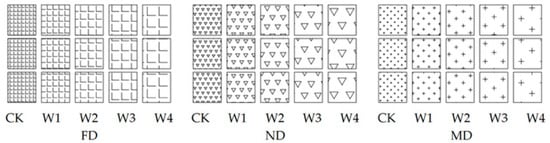 The experiment set three irrigation methods, namely FD, ND, and MD. Under each irrigation method, five water treatments were assigned (i.e., the full irrigation treatment CK (80% FC, FC represents “field capacity”) as the control, and W1 (90% CK), W2 (80% CK), W3 (70% CK), and W4 (60% CK)). Each treatment was replicated three times, and the area of each plot was 5 m × 5.4 m = 27 m2.