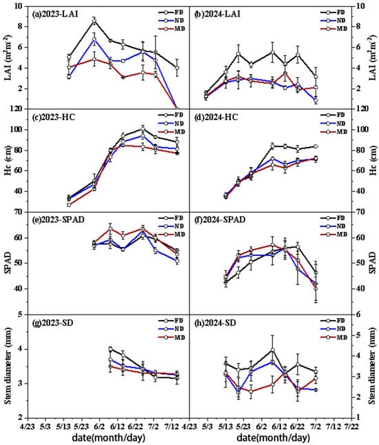Under MD, the growth indicators of the five water treatments are shown in Figure 6. LAI dynamics showed a trend of “first increasing and then decreasing”, and the timing of its peak varied with water treatments. HC continued to grow until maturity, with no significant difference among different water treatments (p > 0.05). SPAD showed an overall single-peak curve and significantly decreased with the reduction in irrigation amount (p < 0.05). SD reached the maximum in the middle and late filling stage, and also significantly decreased with the reduction in irrigation amount (p < 0.05).