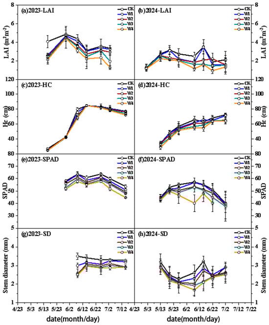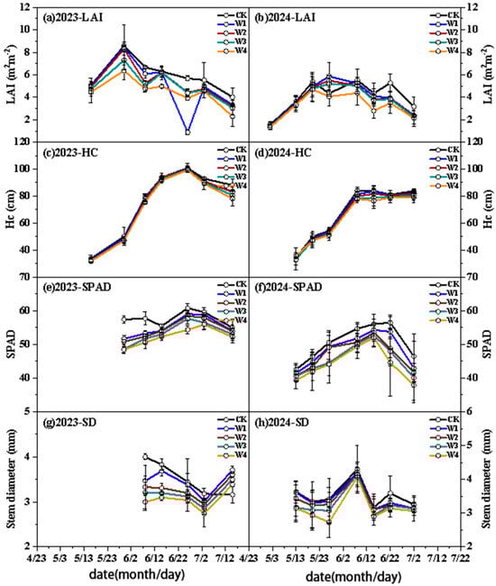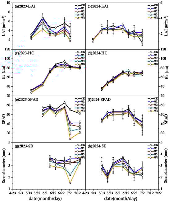 Under ND, the growth indicators of the five water treatments are shown in Figure 5. LAI dynamics showed a trend of “first increasing and then decreasing”, and was positively correlated with irrigation amount (p < 0.05). The LAI under the CK treatment reached the peak in the jointing stage, while the peak of LAI under the W1 to W4 treatments was delayed to the heading stage. The growth pattern of HC was consistent among all treatments, with no significant differences between treatments (p > 0.05). SPAD significantly decreased with the increase in water stress degree (p < 0.05) and reached the peak in the filling stage. The change in SD was positively correlated with the irrigation amount. In 2023, the SD under the CK and W1 treatments was significantly higher than that under W2–W4 (p < 0.05).