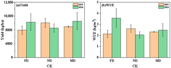 Under the full irrigation treatment (CK), the yield and WUE of the three irrigation methods are shown in Figure 7. In 2023, the yield under the ND treatment was the highest, 27.07% and 12.25% higher than that under FD and MD, respectively (p < 0.05); in 2024, the MD treatment produced the best yield, 2.58% and 23.22% higher than that under FD and ND, respectively. In terms of WUE, in 2023, the WUE under the ND treatment was the highest, 22.62% and 12.32% higher than that under FD and MD, respectively; in 2024, the WUE under the FD treatment was significantly the best, 74.78% and 43.42% higher than that under ND and MD, respectively (p < 0.05).