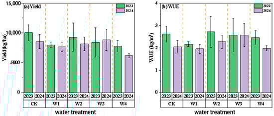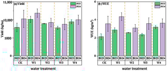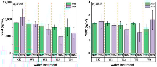 Under ND conditions, the yield and WUE of the five water treatments are shown in Figure 9. In 2023, the CK treatment (full irrigation) had the highest yield, 20.89%, 7.56%, 16.49%, and 22.58% lower than the W1, W2, W3, and W4 treatments, respectively (p < 0.05); in 2024, the W3 treatment had the highest yield. In terms of WUE, in 2023, the WUE under the CK treatment was 2.61 kg·m−3, and the W2 treatment was slightly higher (+3.95%); in 2024, the WUE under the W3 treatment was the highest.