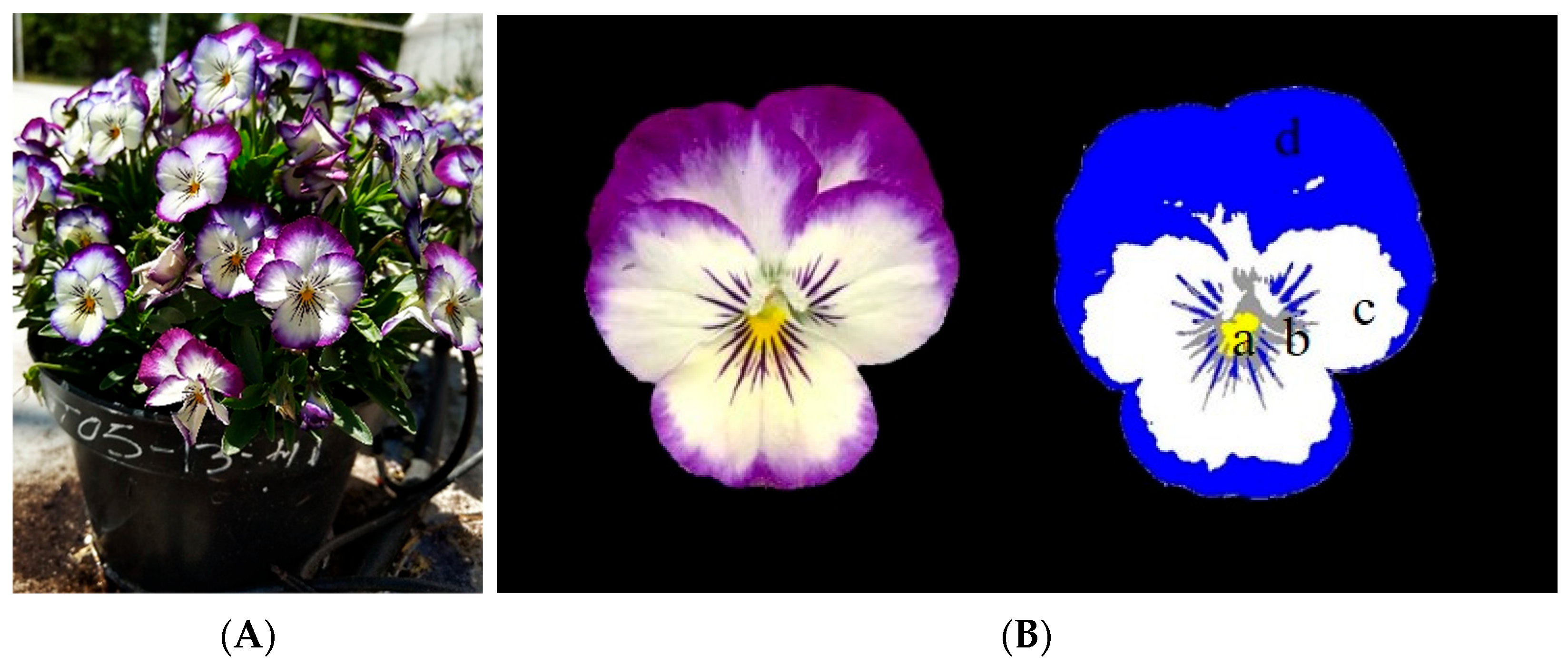 - Yoshioka, Y.; Iwata, H.; Hase, N.; Matsuura, S. Genetic combining ability of petal shape in garden pansy (Viola × wittrockiana Gams) based on image analysis. Euphytica 2006, 151, 311–319. [Google Scholar] [CrossRef]