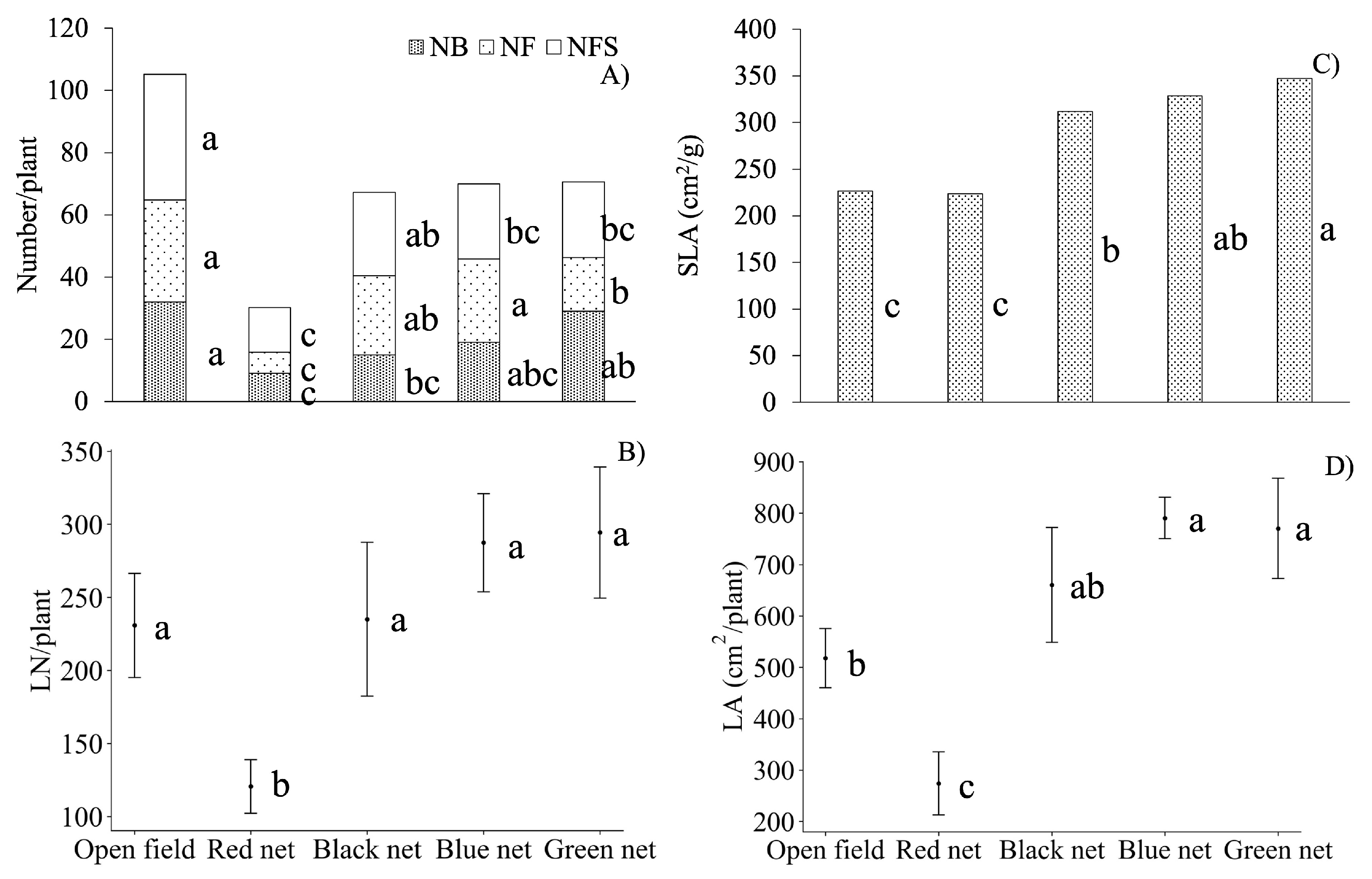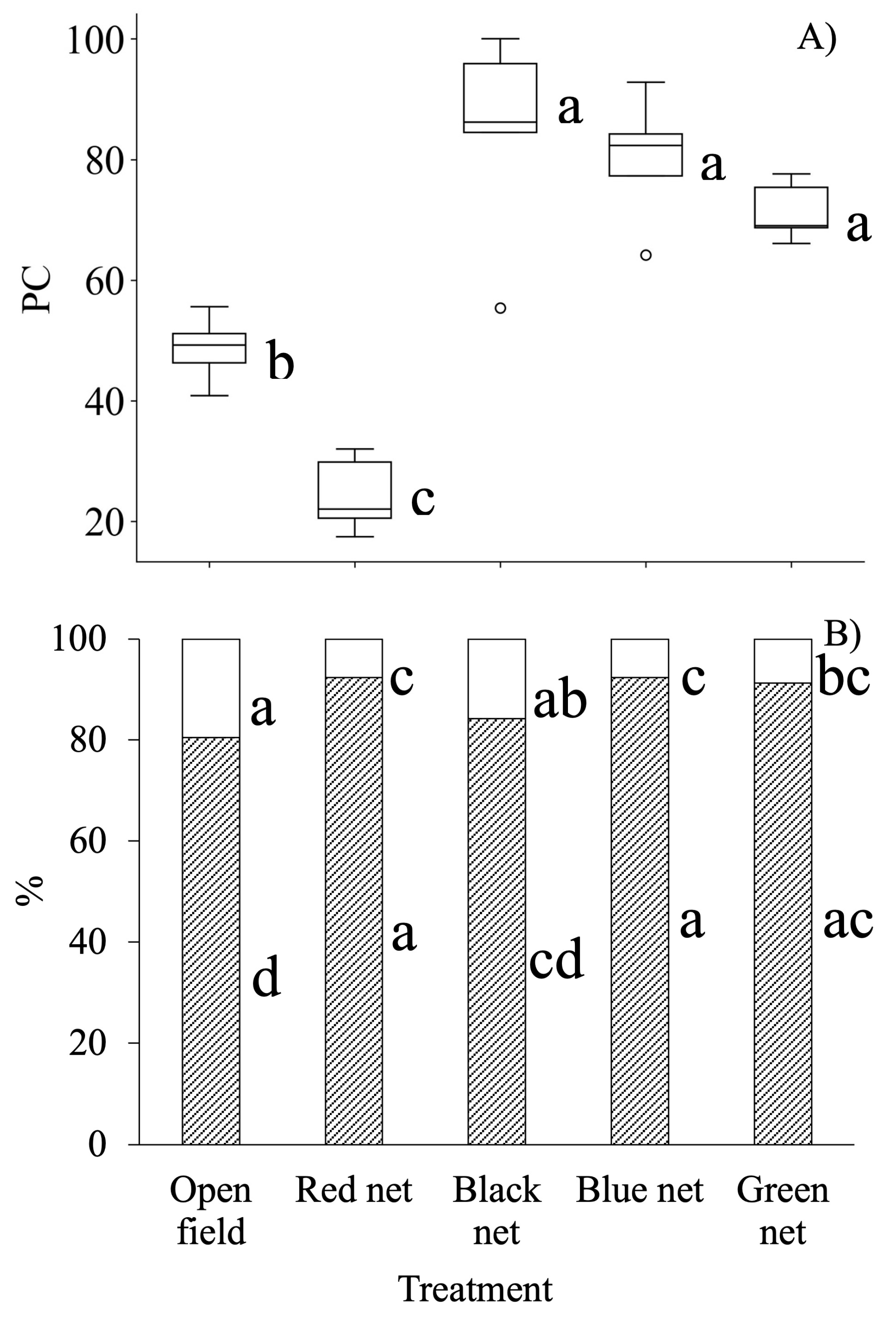 | Black net | T3 | 49.0 b | 24 a | −20 b | |