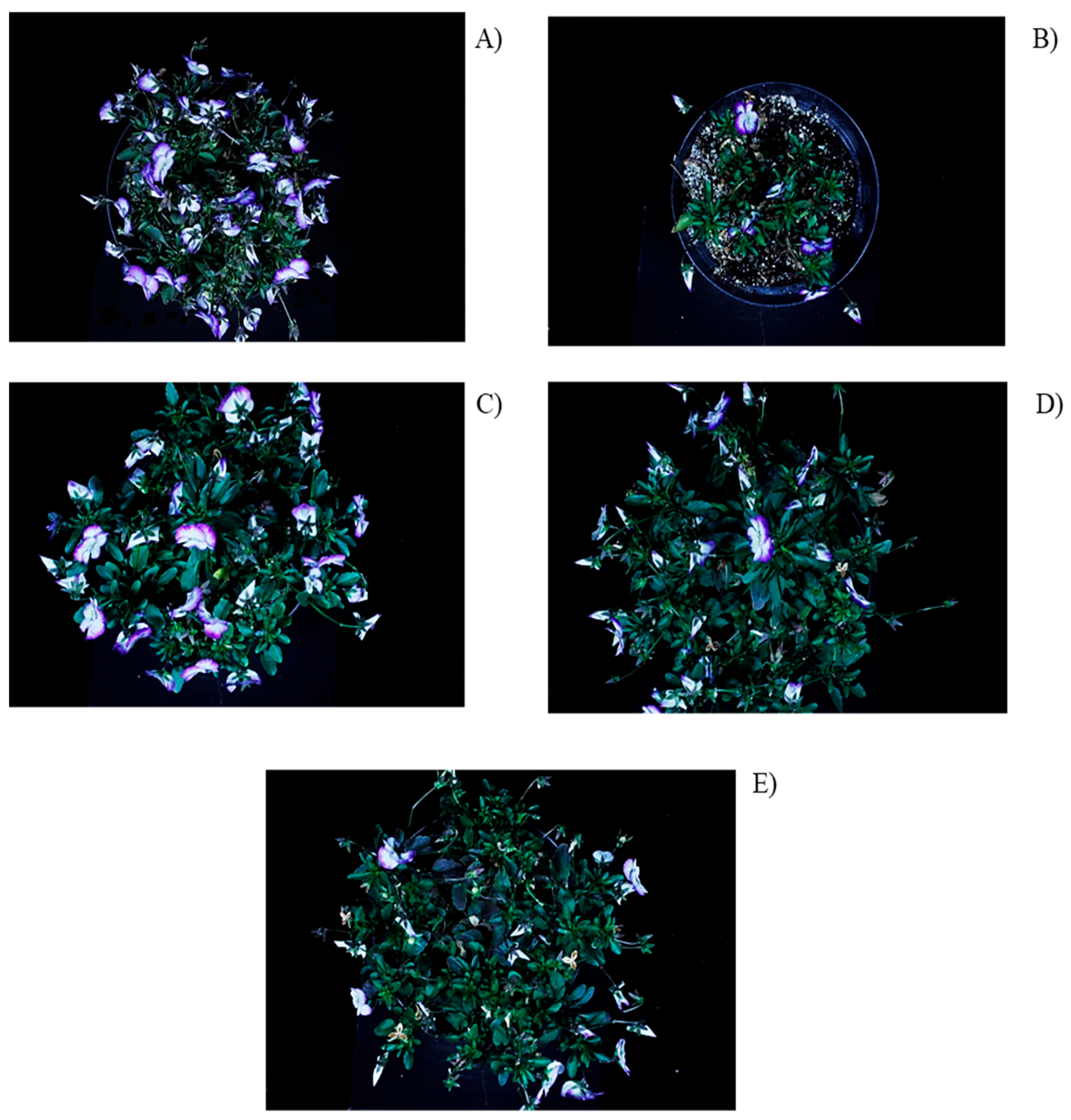 - Warner, R.M.; Erwin, J.E. Prolonged high-temperature exposure differentially reduces growth and flowering of 12 Viola × wittrockiana Gams. Sci. Hortic. 2006, 108, 295–302. [Google Scholar] [CrossRef]