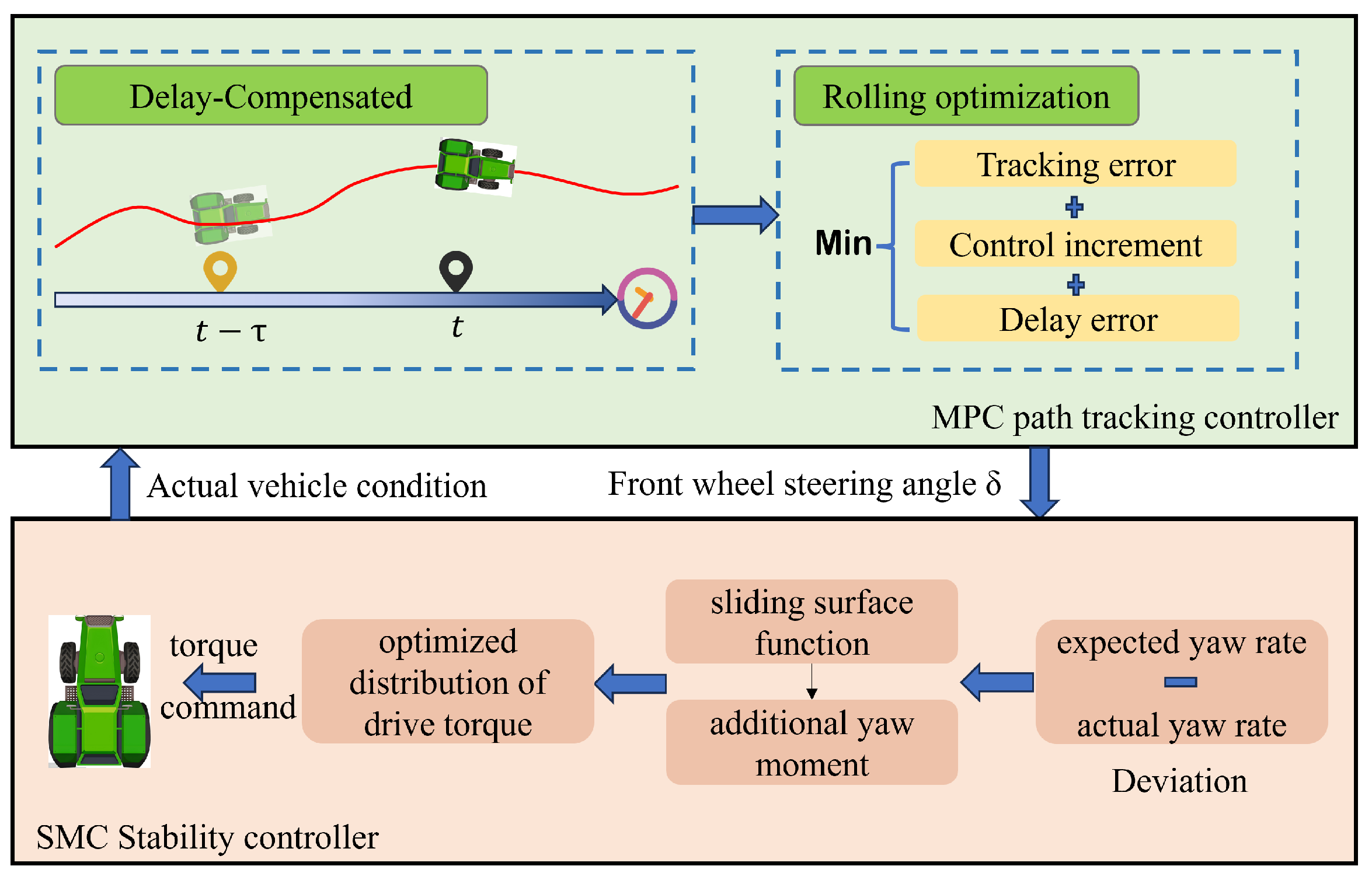 Figure 1, which integrates visual delay compensation and motion control co-optimization. The core contributions of this work are as follows: (1) To tackle the significant delay issues encountered in agricultural machinery vision systems within farmland environments, we introduce a delay compensation algorithm that based on historical compensation errors. By synergizing a delay state observer with the dynamic characteristics of agricultural machinery, we can real-time predict path drift and integrate a real-time compensation correction module at the forefront of the MPC controller. This approach effectively mitigates path tracking deviations caused by delays in image acquisition and processing; (2) We construct a hierarchical coupling framework that interlinks MPC and SMC, fostering a profound synergy between path tracking and dynamic stability through a bidirectional constraint transmission mechanism. The MPC layer generates precise front wheel steering angle commands based on forward-looking optimization, while the SMC layer continuously monitors vehicle stability boundaries in real time and utilizes the sliding surface to swiftly respond and generate active yaw moments, thereby enhancing the system’s robust adaptability to unstructured farmland environments.