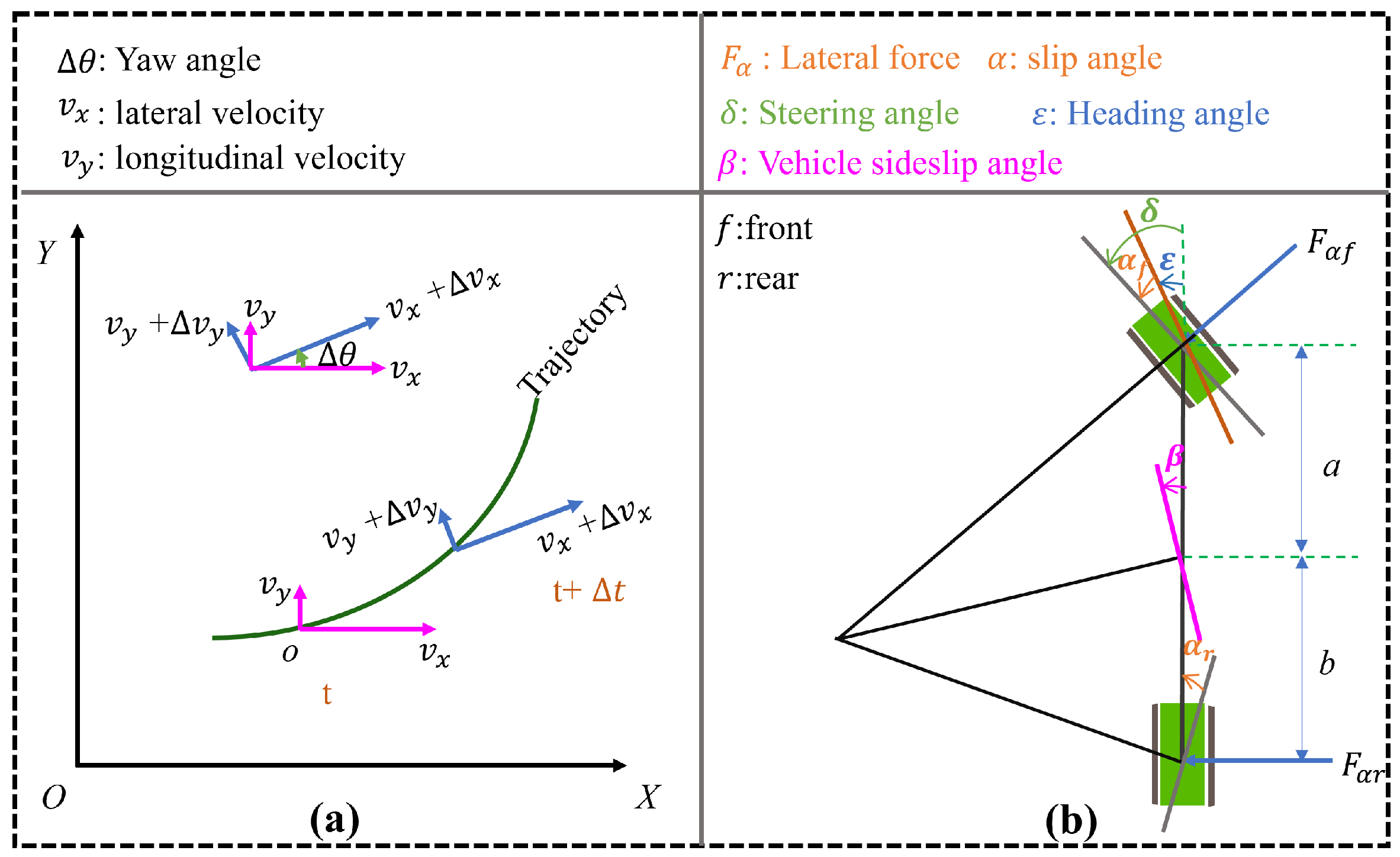 as the moment of inertia of the vehicle about the z-axis, a as the distance from the front axle to the center of mass, and b as the distance from the rear axle to the center of mass. The differential equations describing the dynamics of this two-degree-of-freedom system are established as shown in Equation (