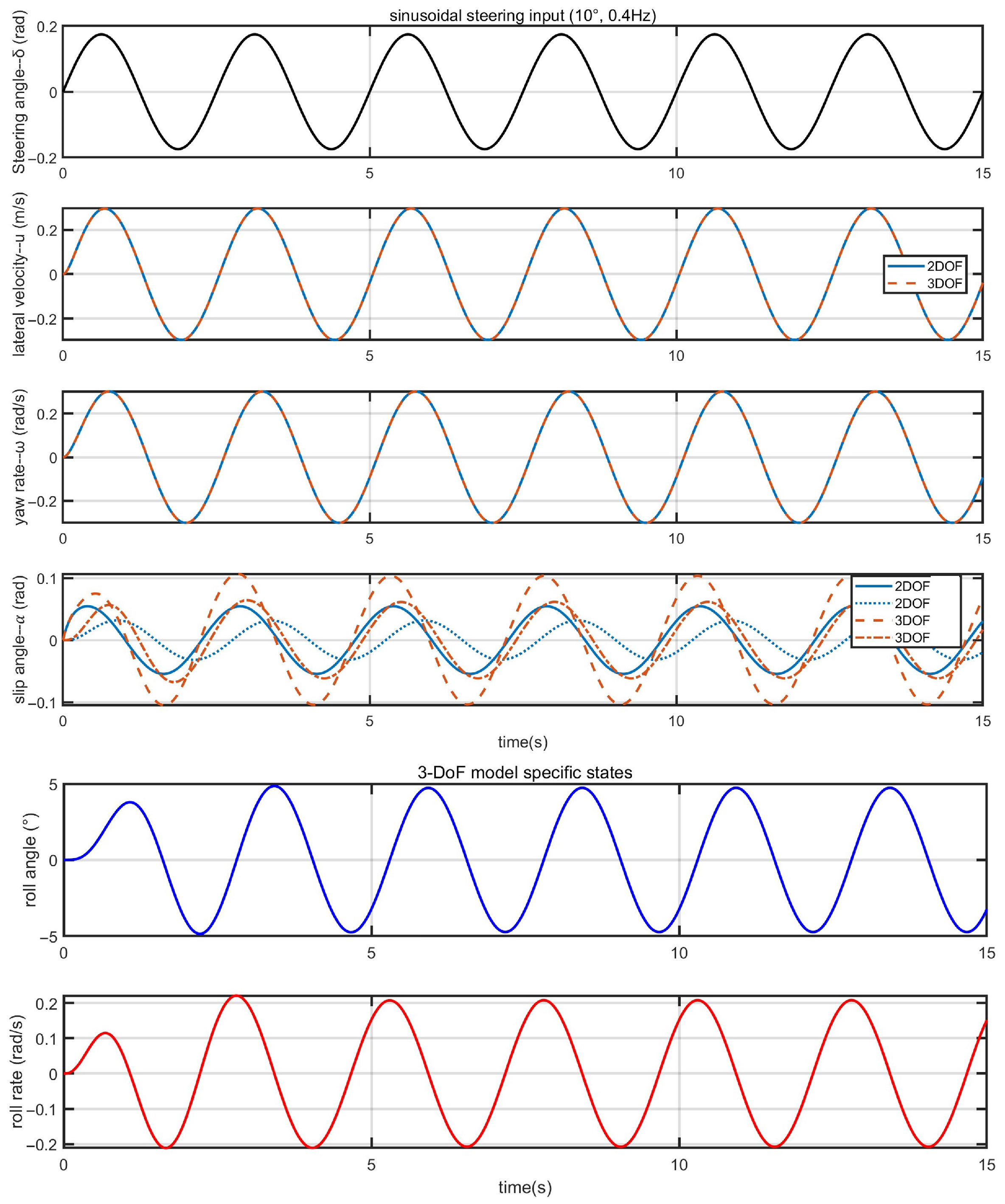 15) to construct the state-space representation, both 2-DOF and 3-DOF single-track models were implemented in MATLAB (version R2021b) and Simulink (version R2021b), with their simulation results compared. With initial values of