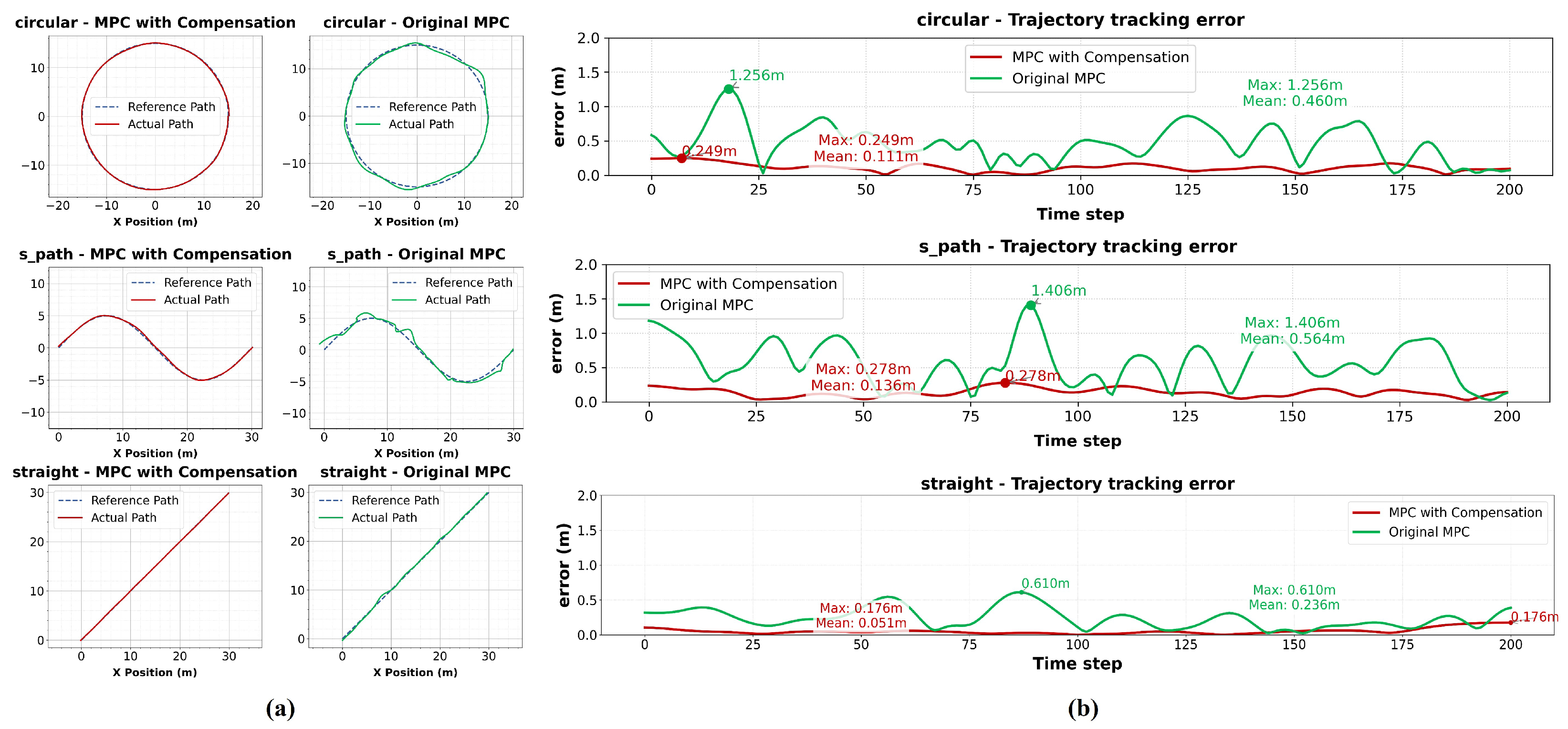 19]. Both approaches break through computational efficiency constraints from data-driven and time-domain optimization perspectives, respectively. To further enhance the robustness of path tracking algorithms in various environments, Zhao et al. integrated an adaptive Extended Kalman Filter (EKF) with model mismatch estimation for state compensation, achieving unbiased path following [