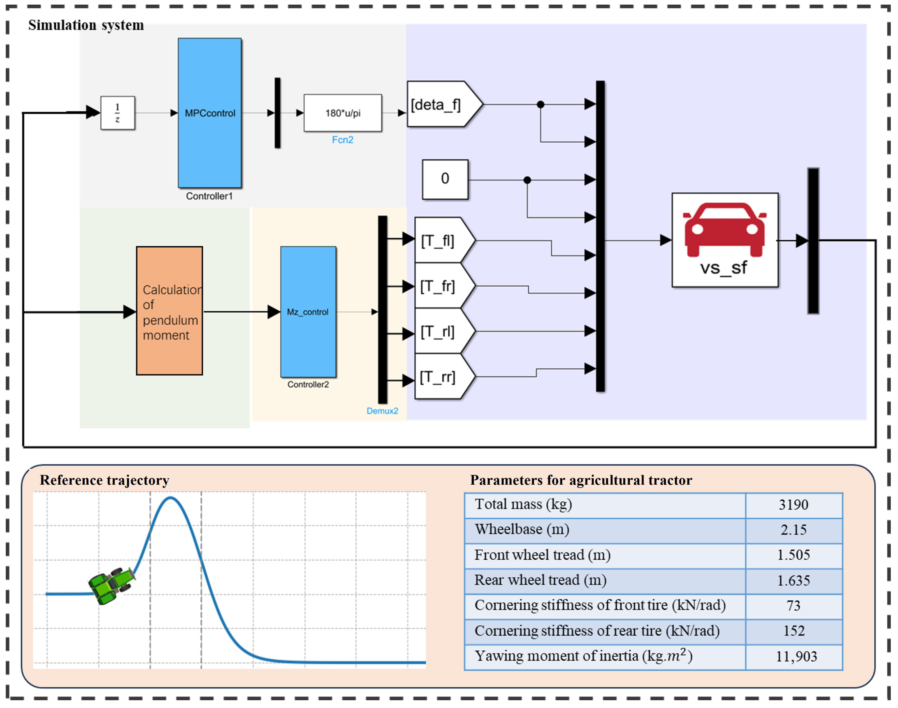 represents the maximum brake torque deliverable by each hub motor, while is the effective wheel radius. This constitutes a quadratic programming problem with linear constraints. The MATLAB fmincon solver computes optimal longitudinal forces for all four tires. The torque command for each hub motor is derived as . The motor controller executes precise torque tracking based on these commands. The presented torque distribution strategy is agnostic to the actuator implementation. For tractors with standard differential braking systems, the optimized yaw moment is naturally executed as a differential braking force between the left and right wheels.