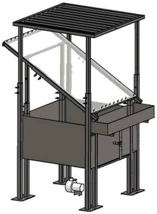 The experimental setup for rainwater permeability testing (Figure 3) evaluates the capacity of an agrotextile to allow rainwater to pass through to the crops and soil below using a rain simulator test bench. This apparatus comprises several water-spraying nozzles, a steel frame supporting net samples exposed to simulated rainfall at inclinations ranging from 0° to 45°, a container collecting water that passed through the nets, and a custom-designed measurement system [14]. The nozzles are spaced at an average distance of 130 cm from the fabric and distribute the water flow evenly over the fabric’s surface area (measuring 1 m2 on a horizontal projection) under test. A centrifugal pump at the bottom recirculates the water back to the nozzles for continuous operation. This system enables the calculation of the rainwater permeability index Φrw [%], which is defined as the ratio of the amount of water that penetrates through a net sample, to the amount of water that falls on the net sample. Using this system, the index Φrw can be calculated as the ratio between the water collected in the container beneath the net sample (V [dm3]) and the total water sprayed by the nozzles:
