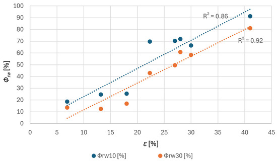 Relationship between porosity ε [%] and the rainwater permeability index Φrw [%] (at 10° and 30° inclination), with linear regression lines and corresponding coefficients of determination (R2).