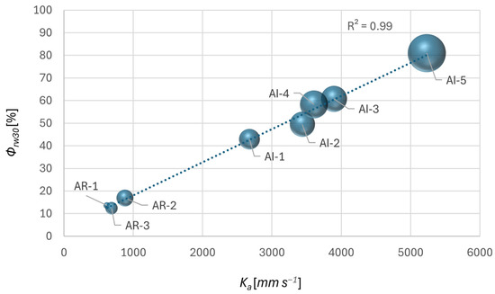 The relationship between the rainwater permeability index (Φrw10 and Φrw30) and porosity ε [%] was analysed using a scatter plot (Figure 4) as well as the relationship between the rainwater permeability index the air permeability index (Φrw10 and Φrw30) and the air permeability index (Ka) was analysed using a bubble chart (Figure 5 and Figure 6), where the size of each bubble represents the geometric porosity ε [%] of the nets. The data in Figure 5 show the differences between the two categories under investigation. The anti-rain nets (AR), characterised by a tight and compact mesh, are located in the low-permeability area (Φrw10 < 30%, Ka < 1000 mm s−1), while anti-insect nets (AI), with a less dense textile configuration, display considerably higher values for both indices, reaching Φrw10 > 90% and Ka > 5000 mm s−1% in the case of the AI-5 net. The distribution of points in the chart confirms a positive correlation between the two indices and highlights the discriminating role of geometric porosity: nets with higher ε values (e.g., AI-5, ε = 41%) tend to show higher permeability to both air and water, while those with lower porosity (e.g., AR-1, ε = 6.9%) show lower permeability levels.