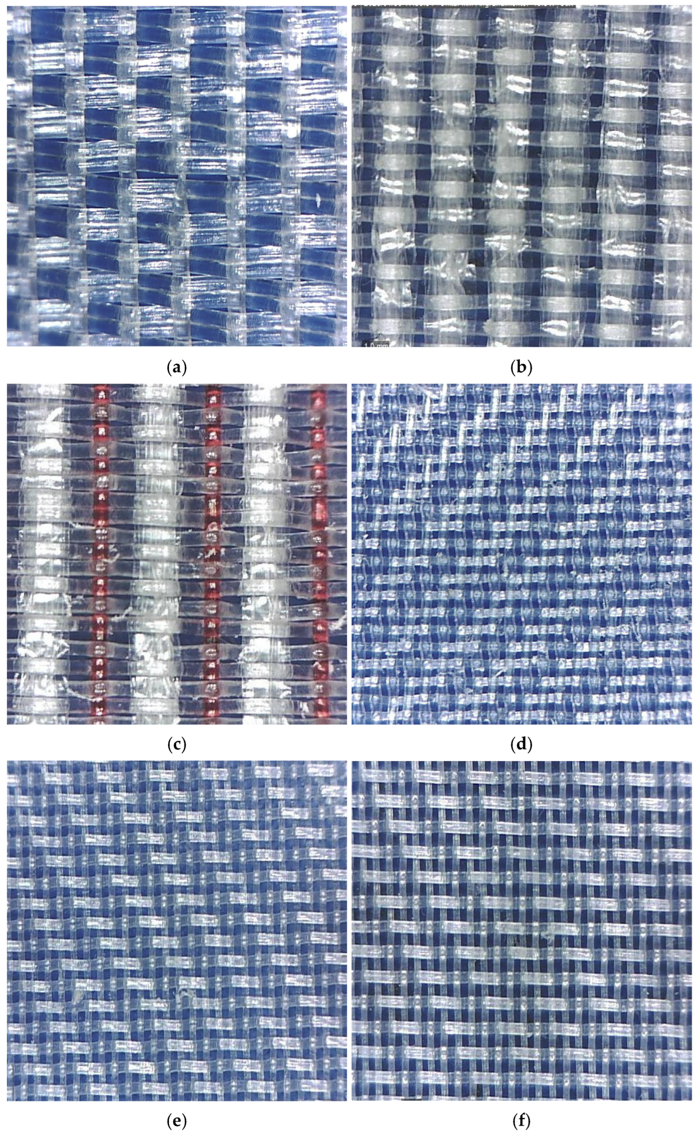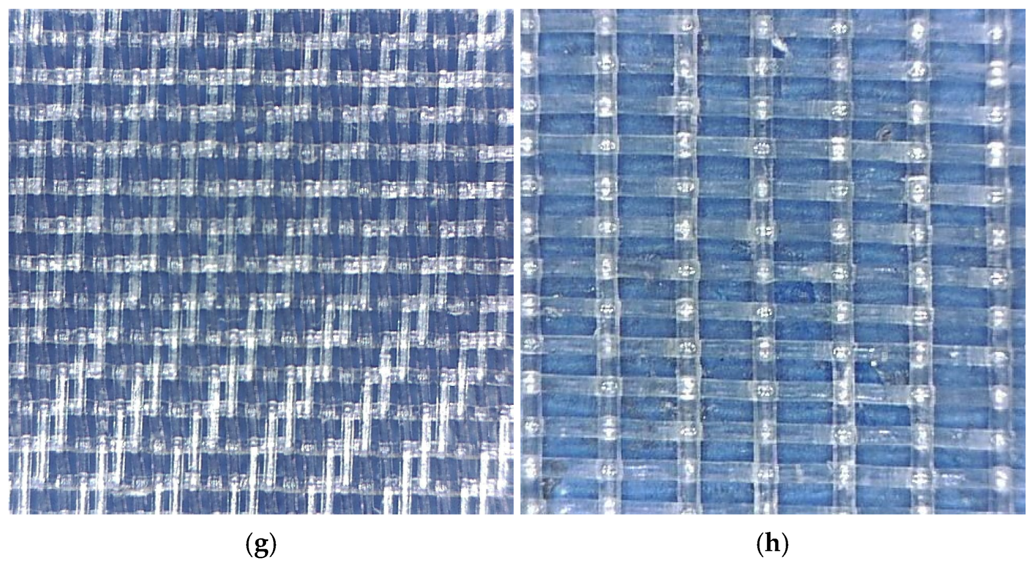 24]. The thickness of the net threads was measured using a micrometer with an accuracy of ±0.01 mm. Before taking measurements, the micrometer was calibrated using certified calibration blocks to ensure the accuracy of the readings. The size of the voids was measured through image analysis methods. A digital microscope (model Dino-Lite AM3013T, Dino-Lite Europe, IDCP B.V., Almere, The Netherlands) with an accuracy of ±0.04 mm at a magnification of 200× was used to capture the images and then Dino-Capture software (version 2.0, Dino-Lite Europe, IDCP B.V., Almere, The Netherlands) was used to measure the voids’ dimensions. The microscope was calibrated using the manufacturer’s calibration slide, and calibration was repeated at the start of each measurement session to minimise drift.