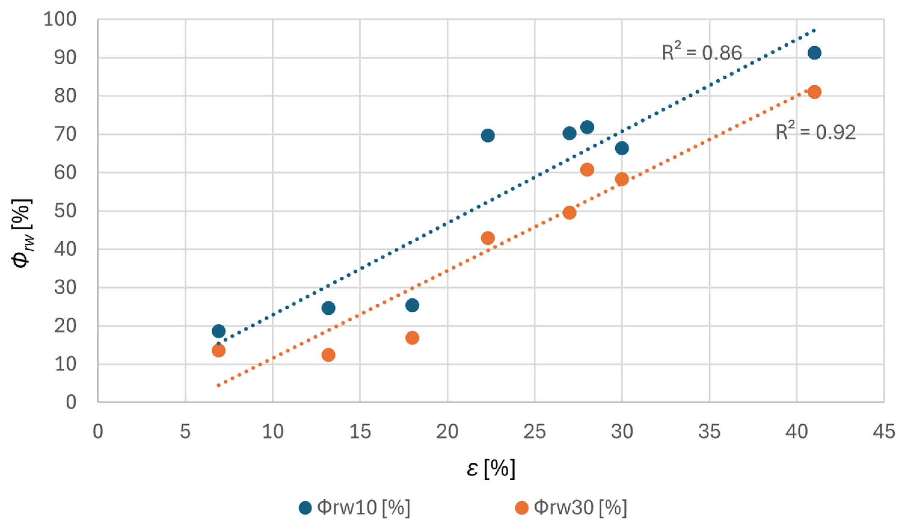 The results of the regression analysis emphasize that Ka is a significantly more reliable predictor of rainwater permeability than porosity. Specifically, the coefficient of determination (R2) between Φrw and Ka reached 0.95 (p < 0.0001) at a 10° inclination and 0.99 (p < 0.0001) at 30°, indicating an almost perfect linear relationship. In contrast, the R2 values for the relationship between Φrw and ε ranged from 0.86 (p = 0.0010) to 0.92 (p = 0.0002), suggesting that, although porosity plays a role, it does not fully account for the fluid–structure interaction involved in rainwater infiltration. The geometric analysis, although informative, does not account for three-dimensional effects such as filament overlap, tortuosity, and partial obstructions.