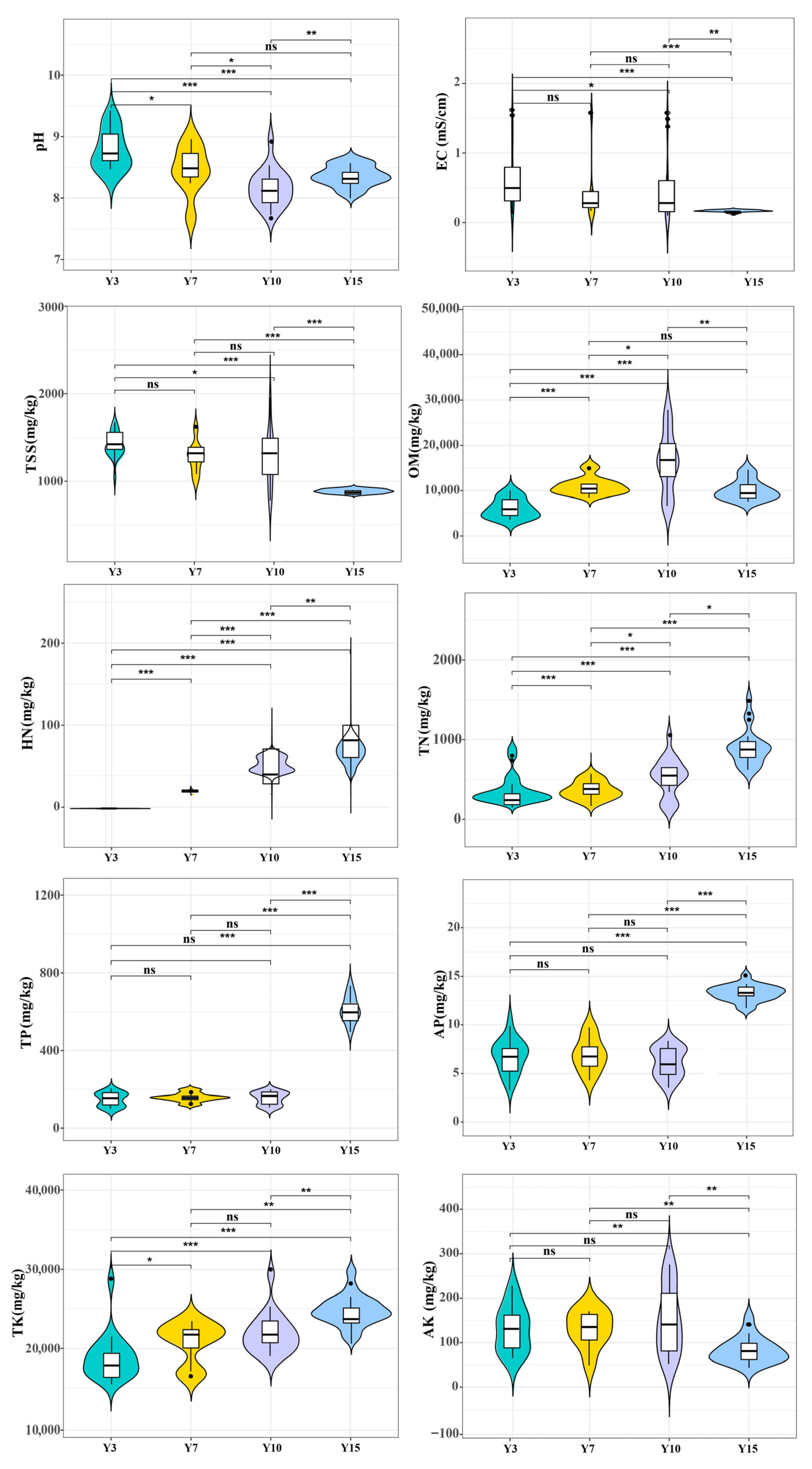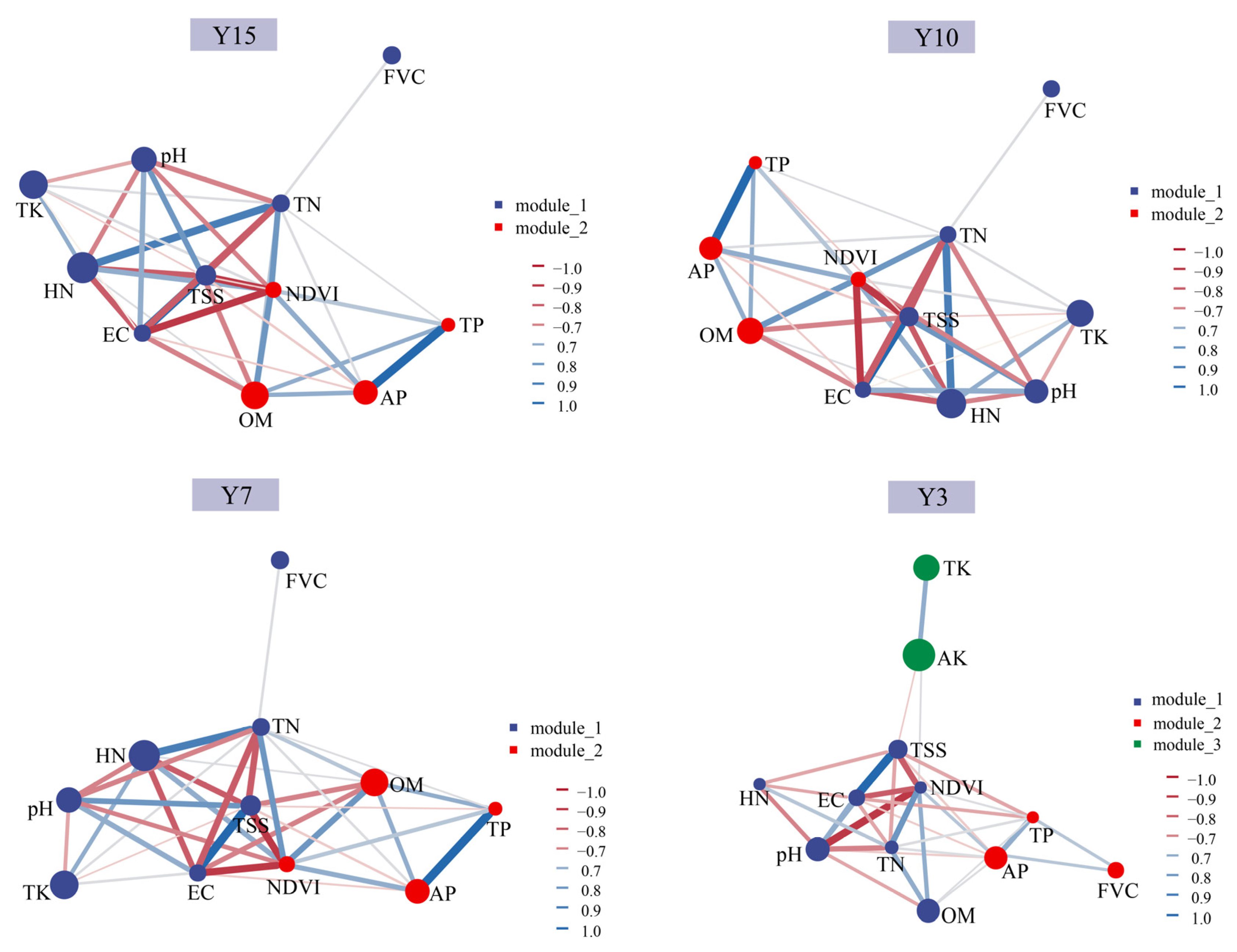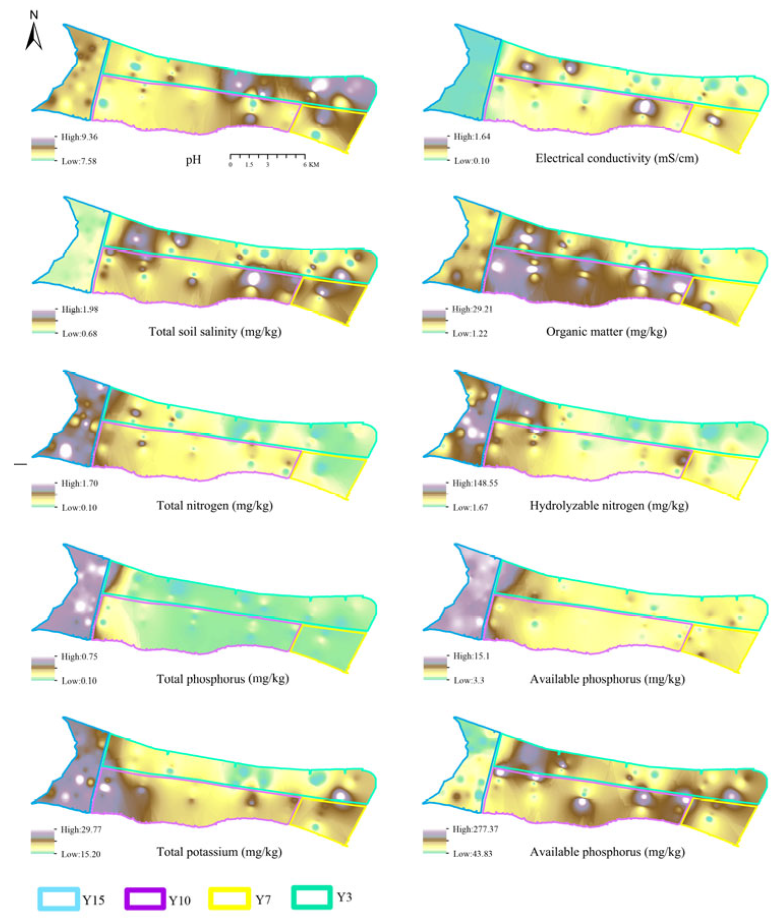 | Soil Physicochemical Properties | Y3 | Y7 | Y10 | Y15 | Changing Trends |
