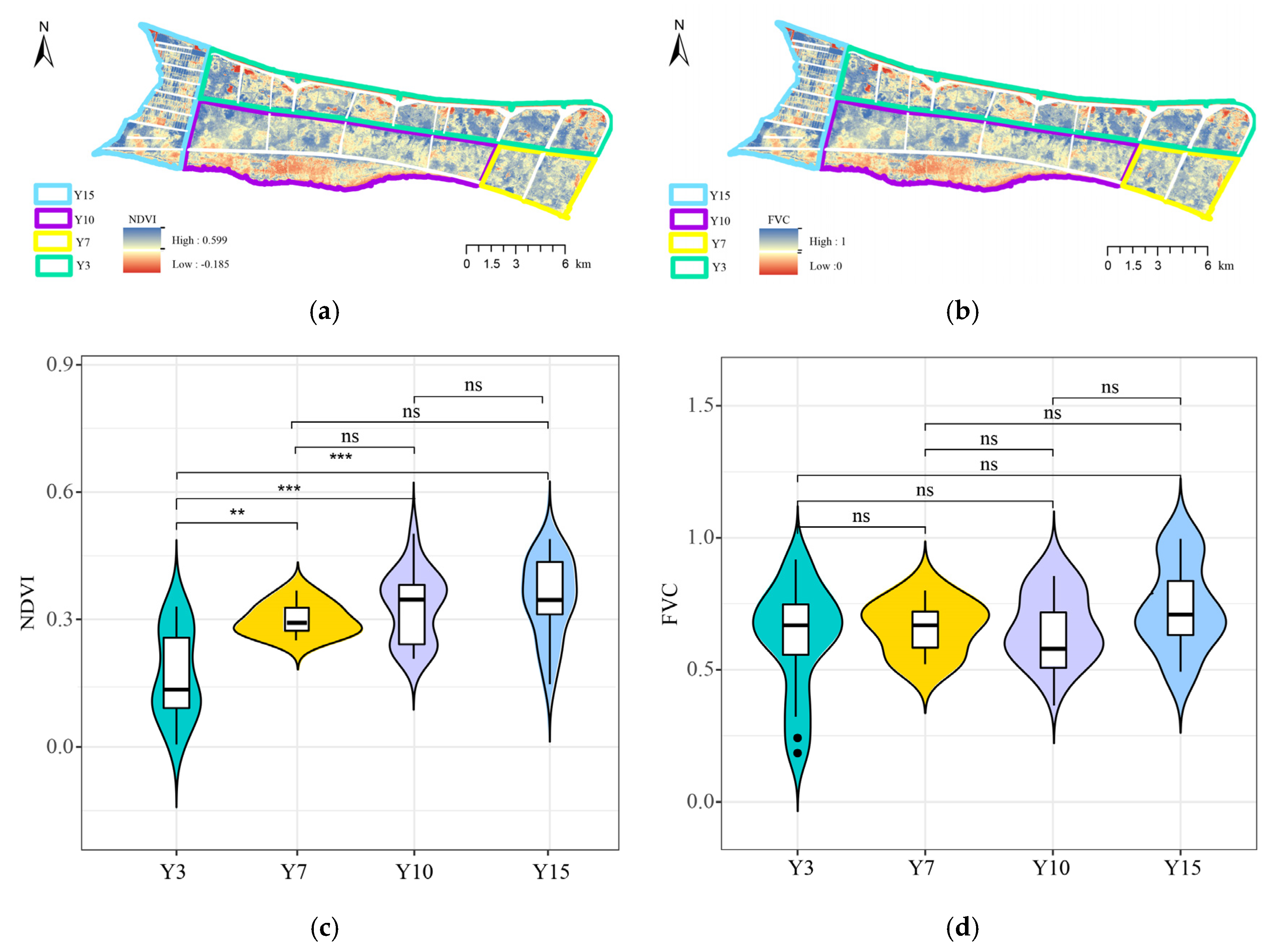 3.2. Differences in Vegetation Cover Across Reclamation Stages