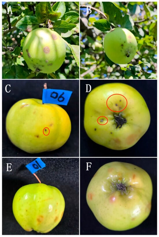 Symptom of XJAU-XY1-1 on wild apple fruits: (A,B) the natural disease symptoms in the field; (C,D) the symptoms after inoculation; (E,F) the control of the disease after inoculation.