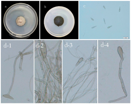 Morphological characteristics of strain XJAU-XY1-1: (a) Colony frontal morphology at 30 d. (b) Colony abaxial morphology at 30 d. (c) Conidia. (d1–d4) Conidiophore.