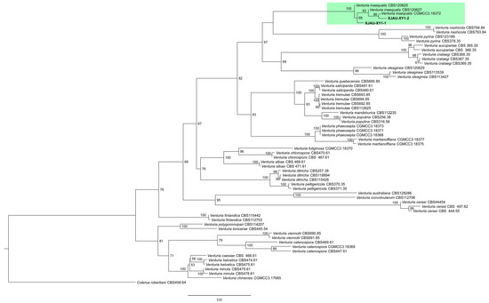The sequences obtained in this study were preliminarily identified by BLAST search to confirm their taxonomic classification. Reference sequences of Venturia inaequalis were downloaded from Marin-Felix Y and Zhao P et al. [33,34]. Coleroa robertiani (CBS458.64) was selected as the outgroup taxon. The five individual loci (ITS, LSU, rpb2, tef1, and tub2) were aligned using MAFFT v. 6.0 and manually edited using MEGA v. 7 [35,36]. Then, the five loci were combined and analyzed using maximum likelihood (ML) and Bayesian inference on the CIPRES Science Gateway platform [37]. A phylogenetic tree was constructed using FigTree 1.4.0 software.