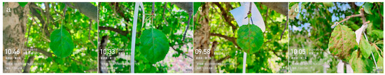 Manifestation of apple scab damage on wild apple leaves: (a) Initial stage. (b) Middle stage. (c) Late stage. (d) Terminal stage. The non-English terms include the camera’s built-in time and location watermarks.