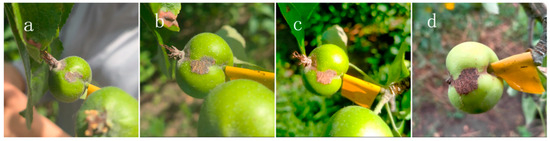 Manifestation of apple scab damage on wild apple fruit: (a) Initial figure: (a) Initial stage; (b) 15 days after infection; (c) 30 days after infection; (d) 50 days after infection.