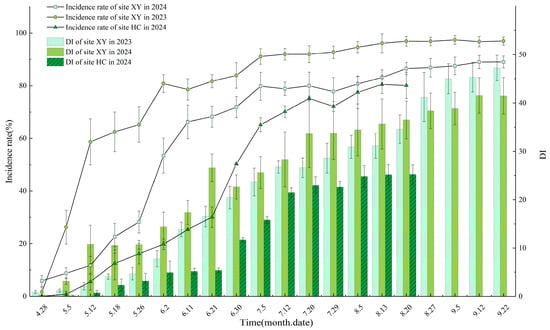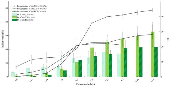Field surveys revealed that apple scab symptoms on leaves in Ili’s wild fruit forests first appeared in late April, with an initial incidence of 1.66%. Incidence surged to 80.81% by early June, accompanied by a rapid increase in disease index to 13.88–14.39. Both parameters peaked in late August (maximum incidence: 98.87%; maximum disease index: 50.02) before stabilizing. Analysis indicates disease initiation occurs between late April and late May, enters a rapid escalation phase in early June, becomes epidemic from June to July, peaks in late August, and stabilizes with minimal increase through August and September. From late April to late September 2023 and 2024, both incidence and disease index showed an overall rising trend followed by stabilization post-peak. Although the 2024 disease index was lower than 2023 (peak: 41.55 vs. 47.24), incidence was higher (94.72% vs. 89.04%) (Figure 6). Epidemic curves for both XY and HC plots exhibited rapid initial growth followed by stabilization after peak severity.