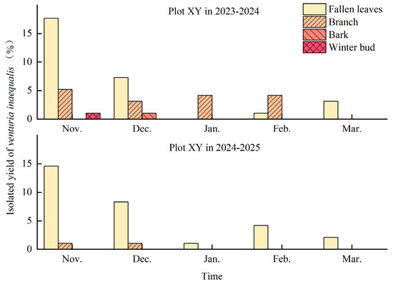The study revealed a consistent pattern in pathogen isolation quantity across both 2024 and 2025, characterized by a monthly decline. Venturia inaequalis was successfully isolated from fallen leaf tissues every month. Among different plant organs, higher pathogen isolation rates were consistently observed from fallen leaves and twigs. Overall isolation rates were consistently higher in the XY plots than in the HC plots.