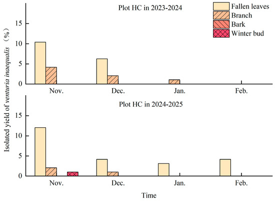 In the HC plots, the pathogen isolation rate for apple scab gradually declined from November to February during both overwintering periods, with the overall rate in 2024–2025 being lower than in 2023–2024. In November, the pathogen was primarily isolated from fallen leaves and twigs (isolation rates: 12.04% and 10.42%, respectively). From December to March, isolation occurred predominantly from fallen leaves (Figure 9).