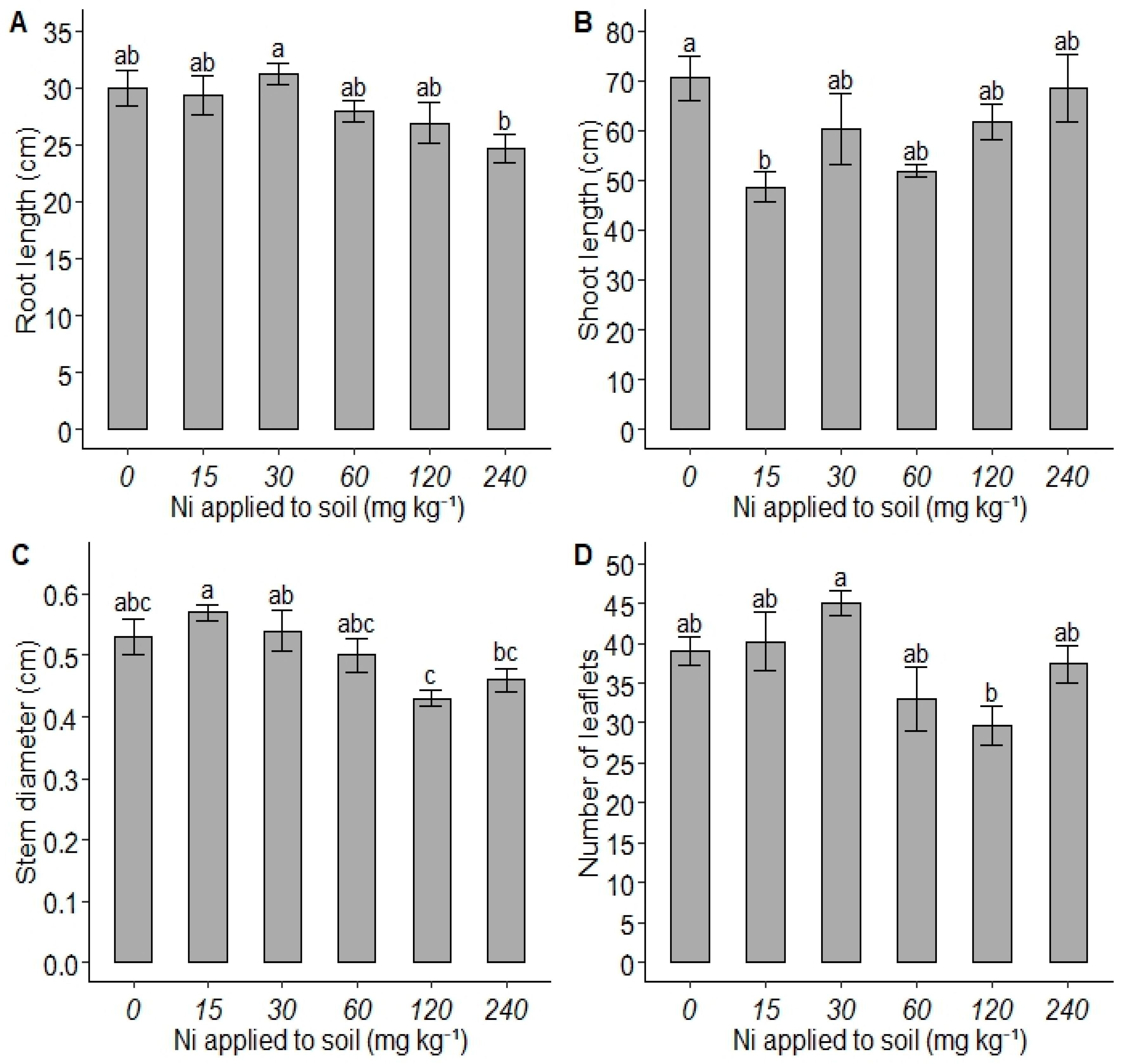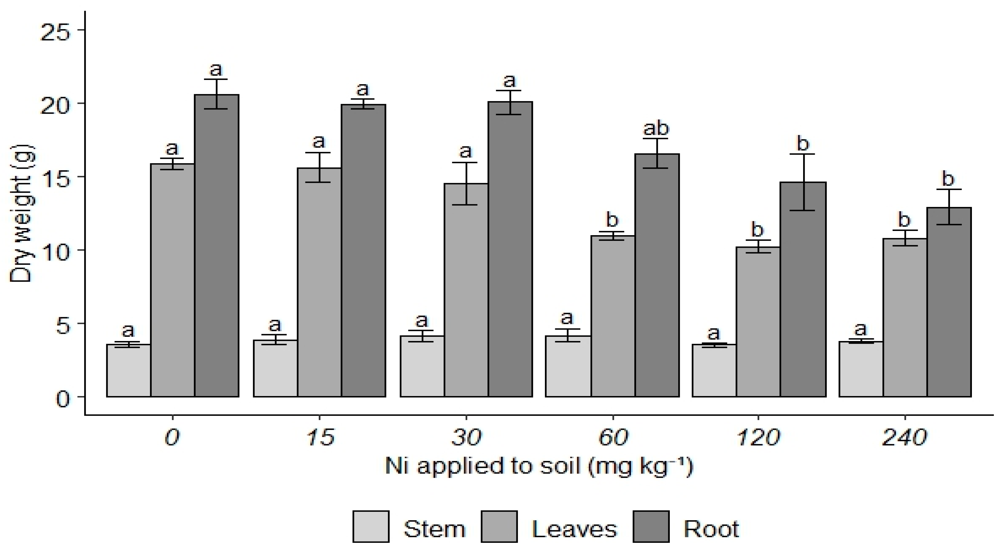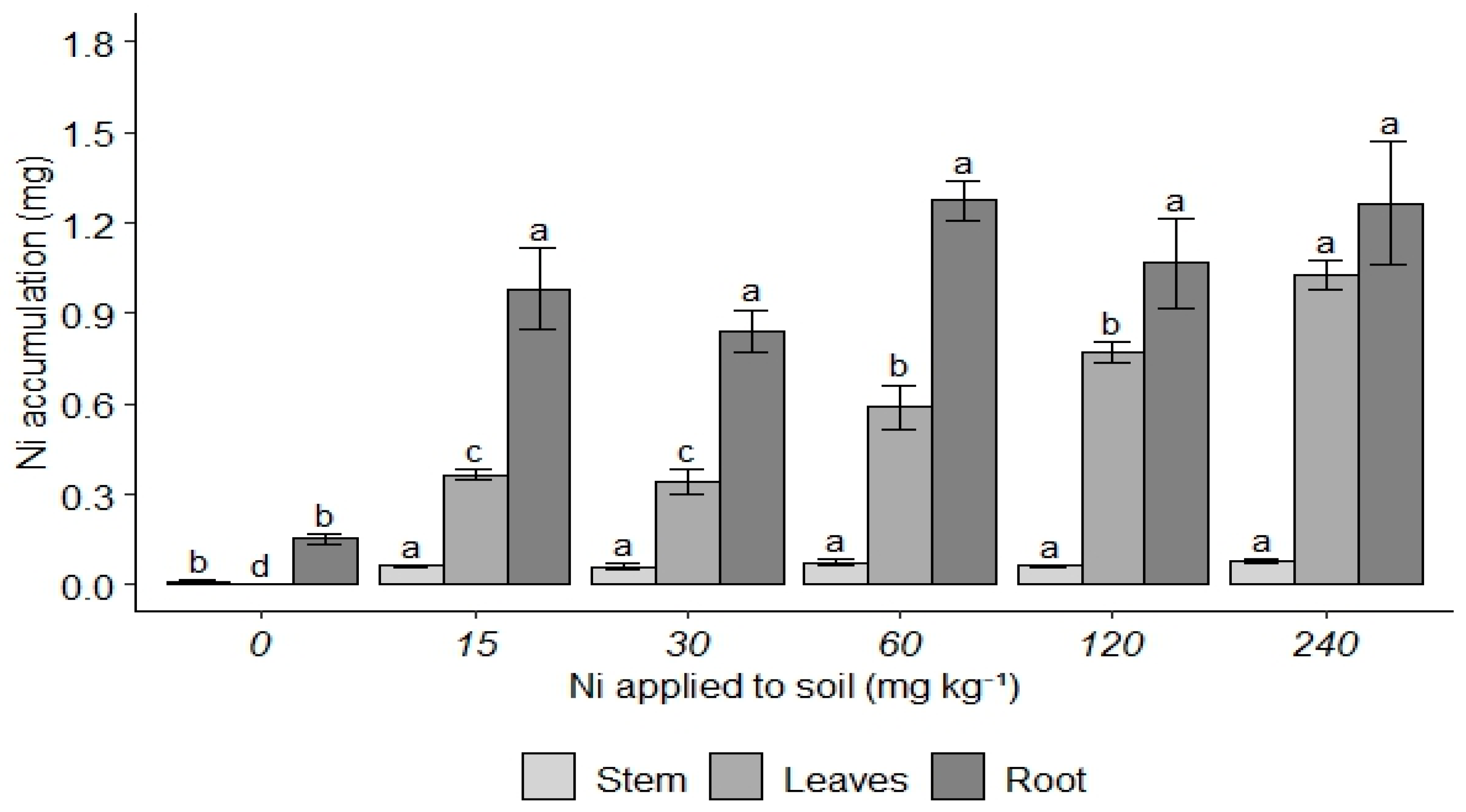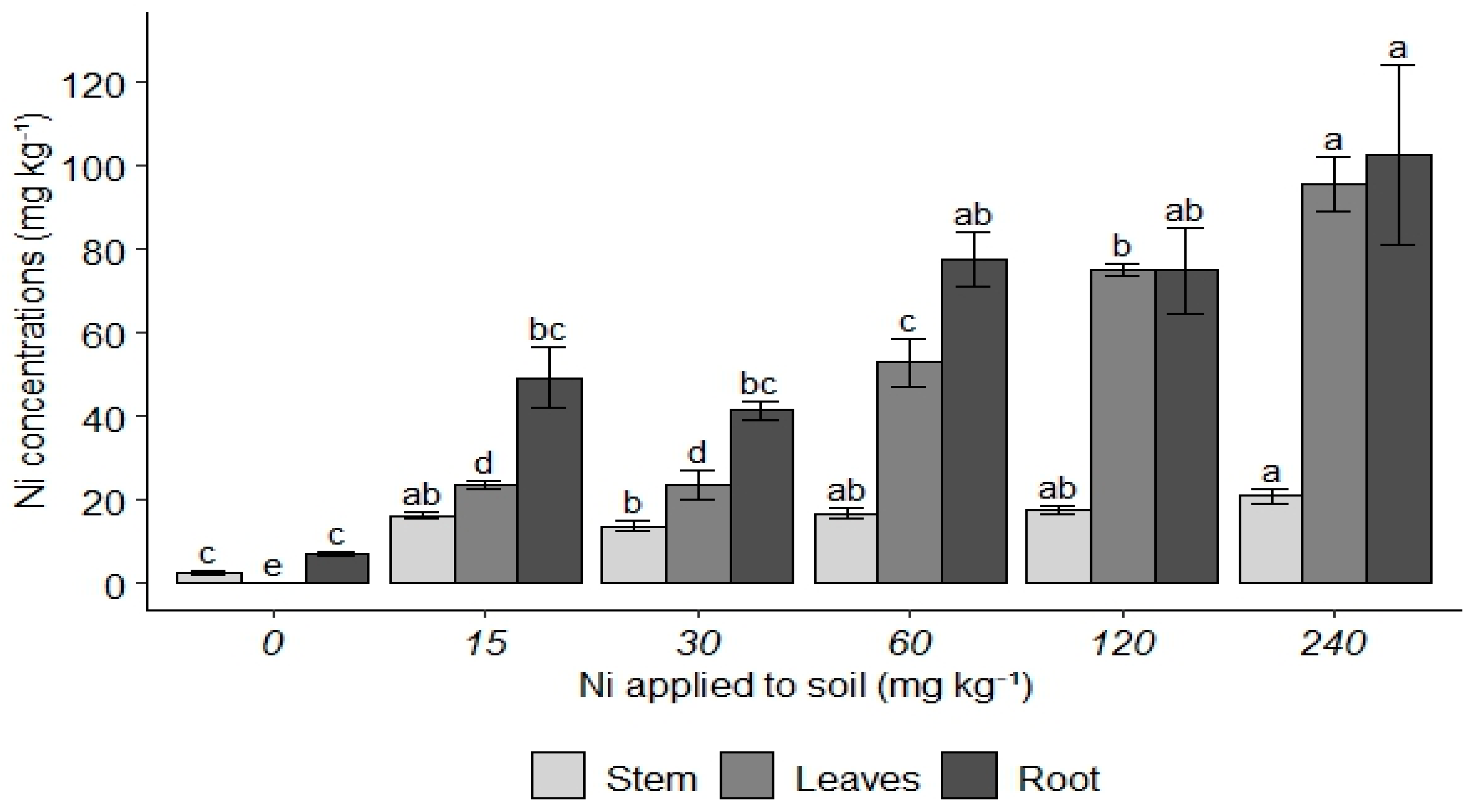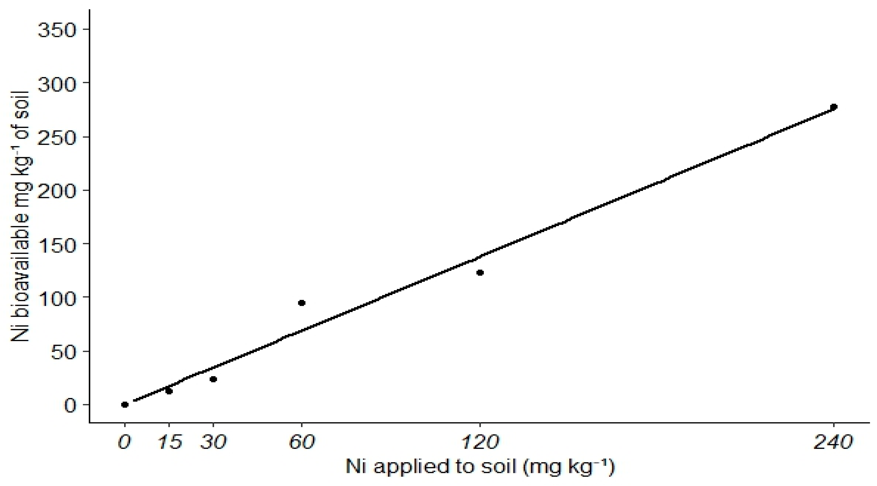 2.3. Ni Concentration in Soil Samples and Plant Tissues